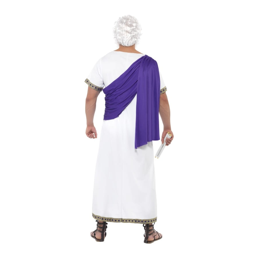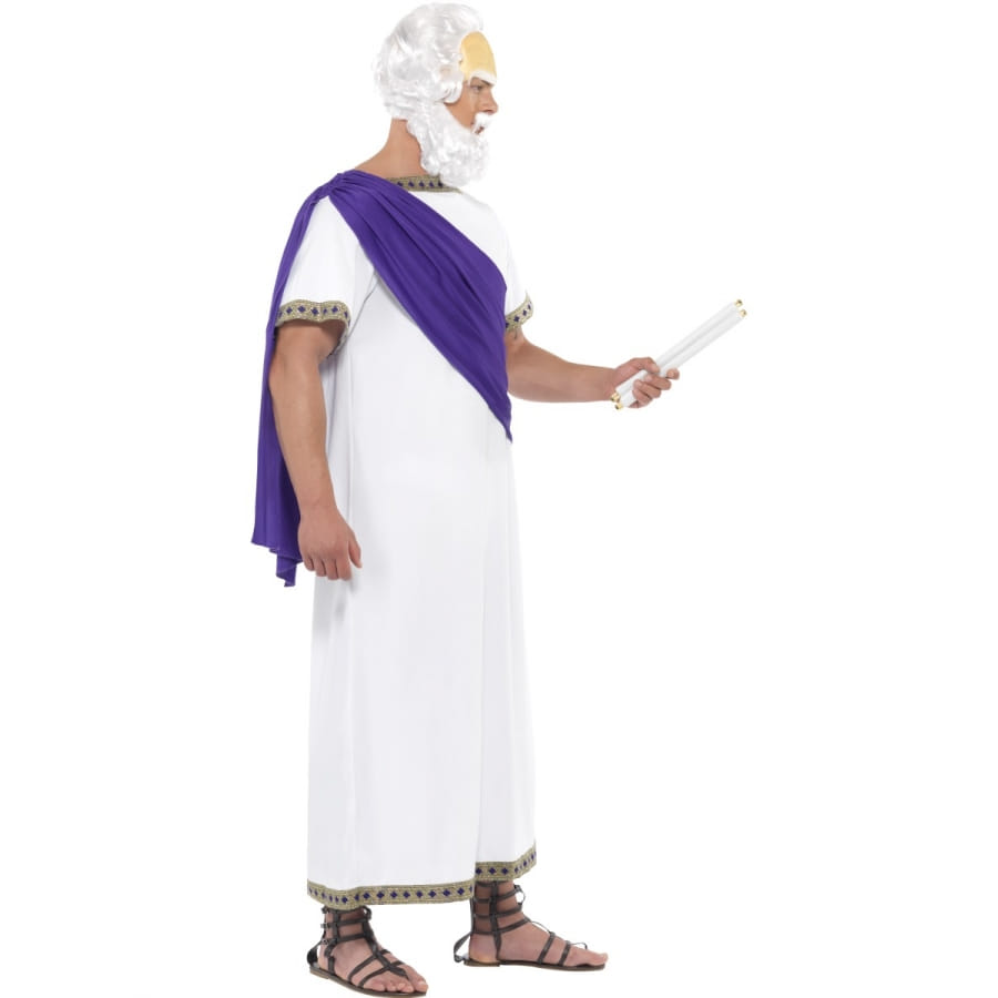Déguisement de Socrate, pour homme, composé d'une longue robe blanche à bordure dorée et ornée d'une foulard bleu ainsi que d'un rouleau. La robe est disponible en taille S, M ou L. Elle vous transformera en philosophe grec révolutionnaire!
