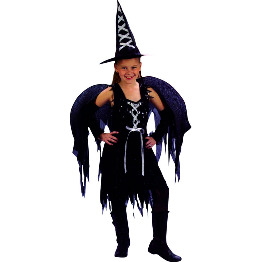 Pour être la plus belle pour le carnaval rien de mieux que ce joli déguisement de sorcière. Ce déguisement est destiné pour les filles de 7 à 9ans. Elle peut aussi le mettre pour Halloween. Il est composé d'une robe noire sans manche avec lacets argenté sur le devant, d'une coiffe pointu avec lacet argenté et une paire d'ailes noire.