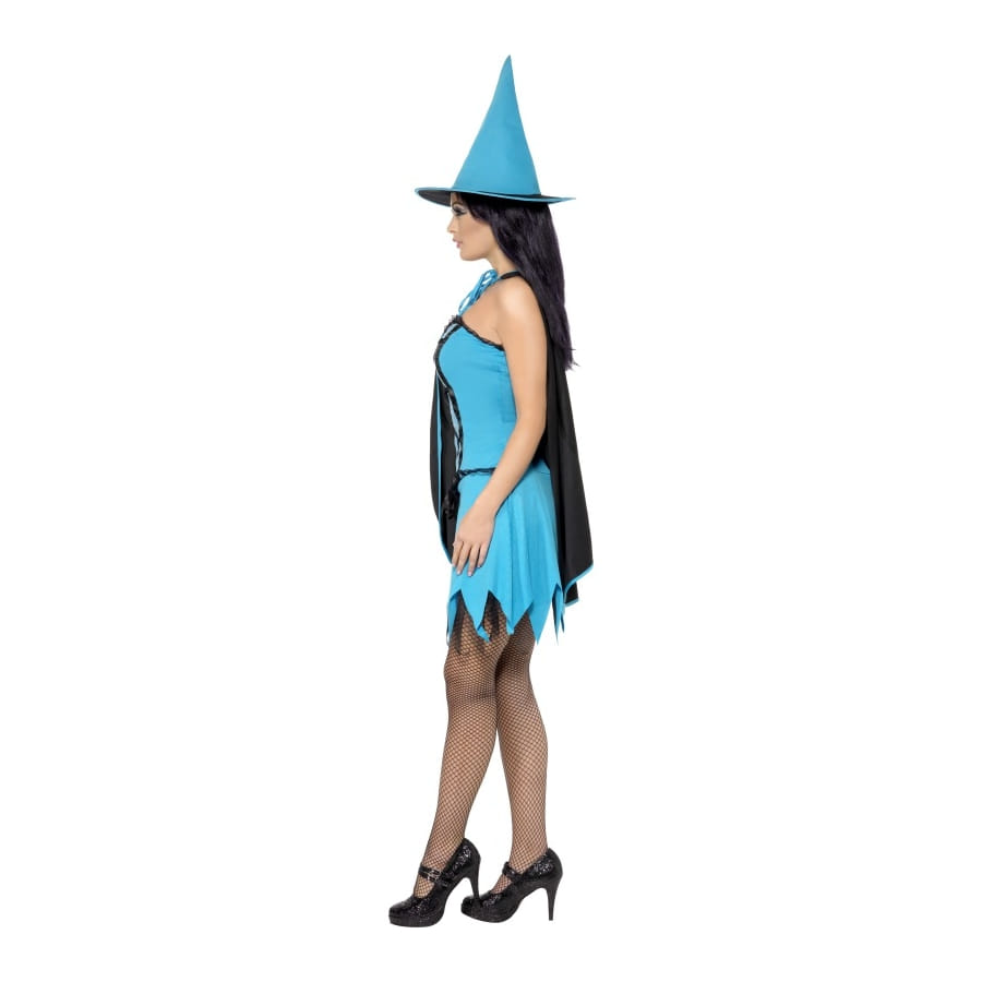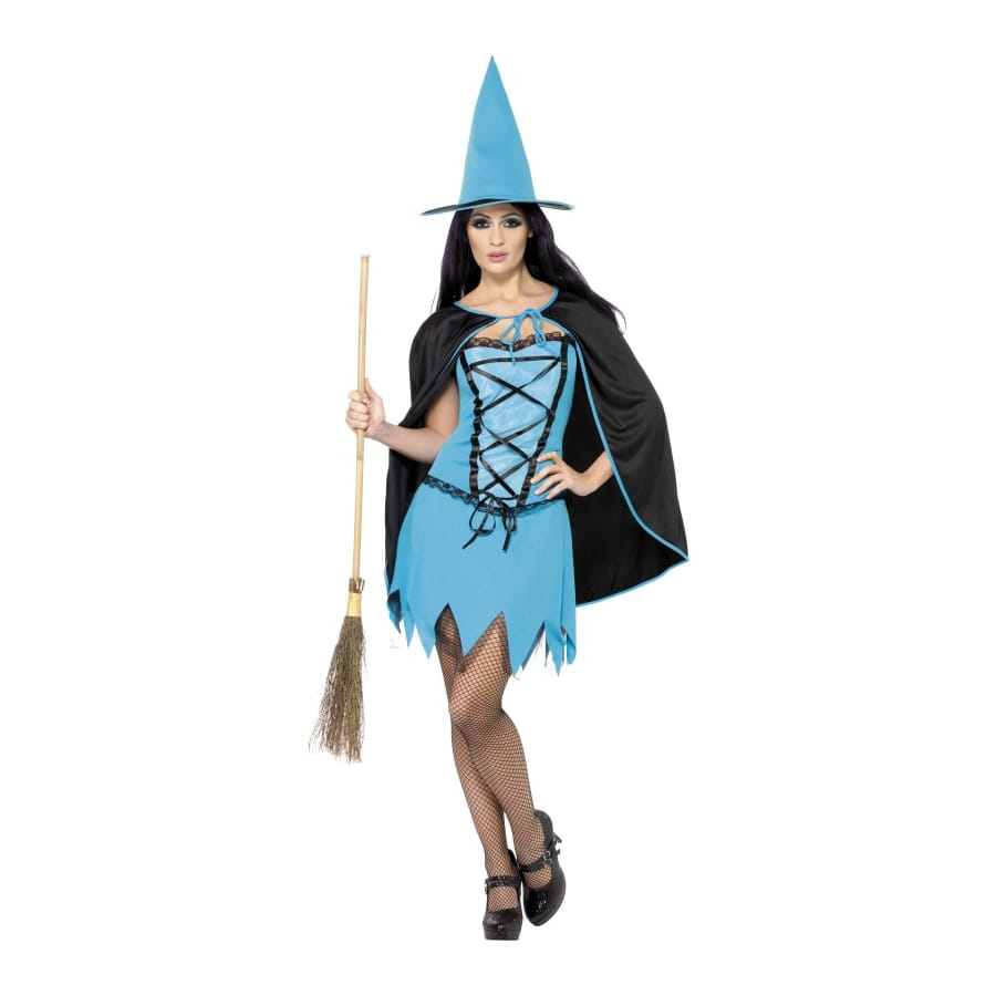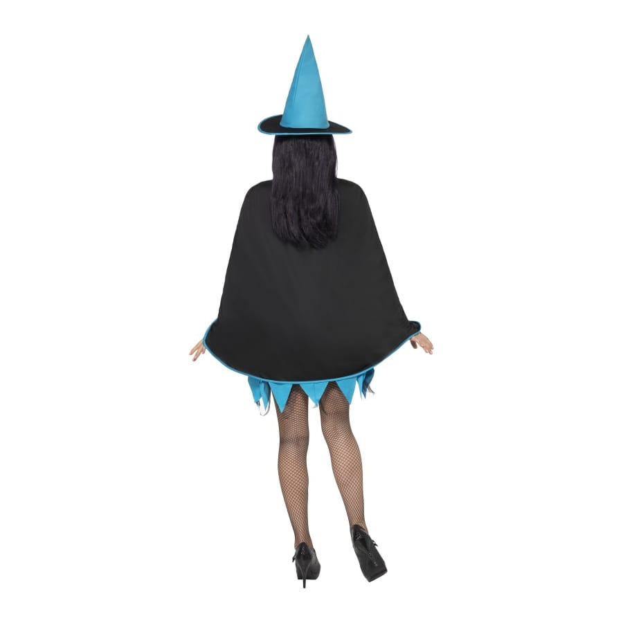 Ce costume de sorcière est parfait pour Halloween. Ce costume est composé d'un chapeau pointu de couleur bleu, d'une cape noir avec bordure bleu et lacet. Il est aussi composé d'une robe courte de couleur bleu avec lacet noir sur le devant.