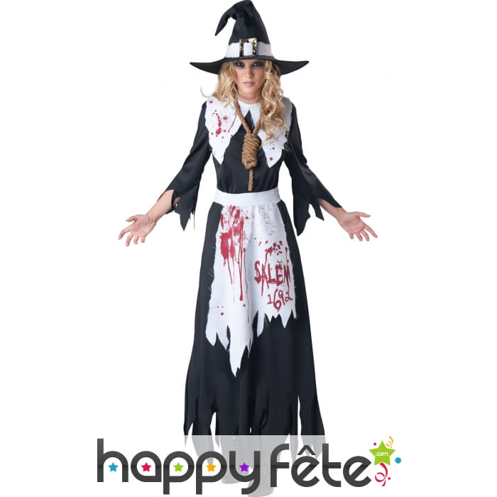 Ce Déguisement de sorcière de salem ensanglanté se compose d'une robe, d'un noeud coulant et d'un chapeau.