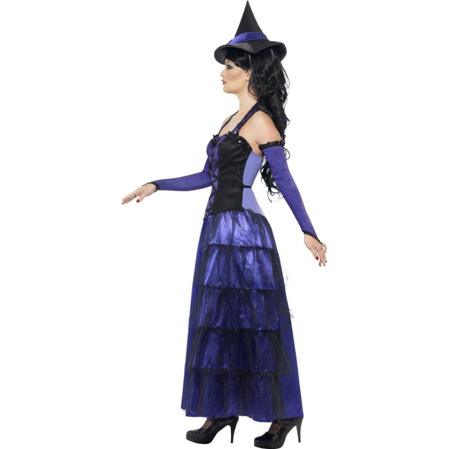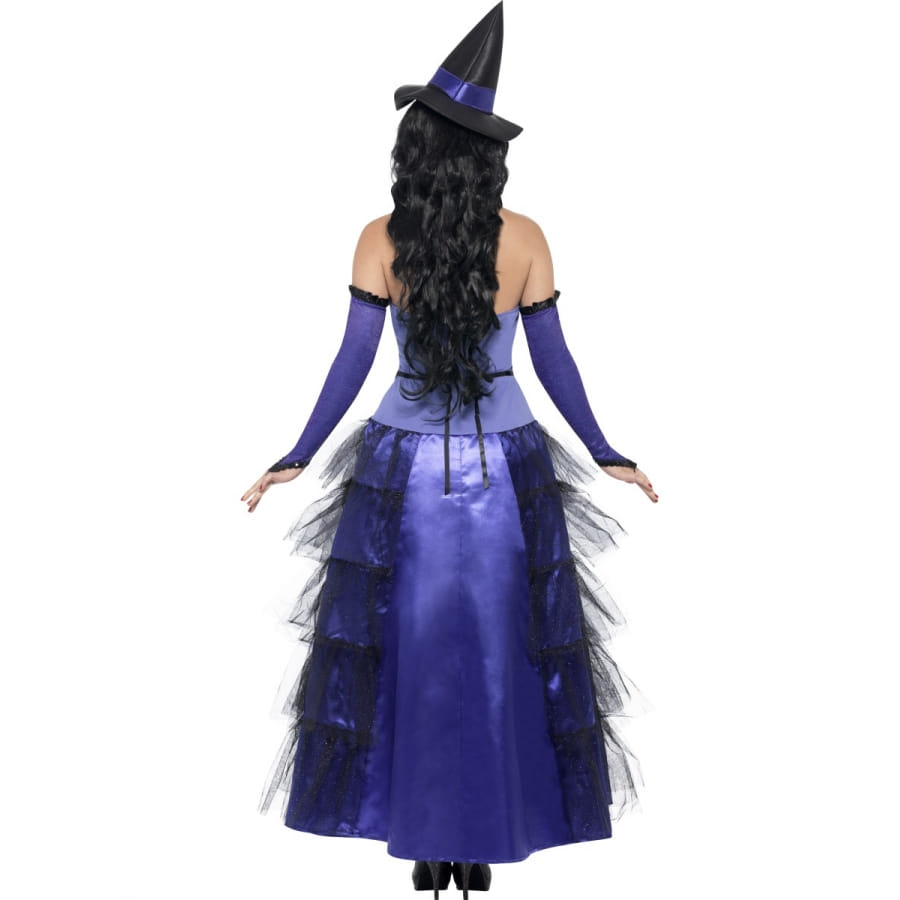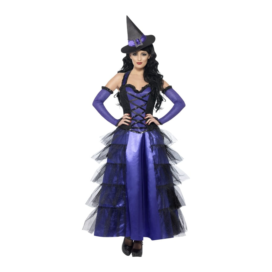 Ce costume de sorcière sera parfait pour une soirée d'épouvante ou encore une soirée halloween. Ce déguisement est composé d'un chapeau noir avec une bande violet dessus , d'une paire de gant qui est long de couleur violet, l'extrémité est noir ainsi que d'une longue robe avec des voiles sur le coté.