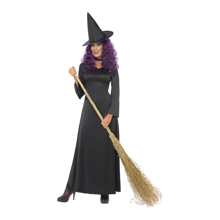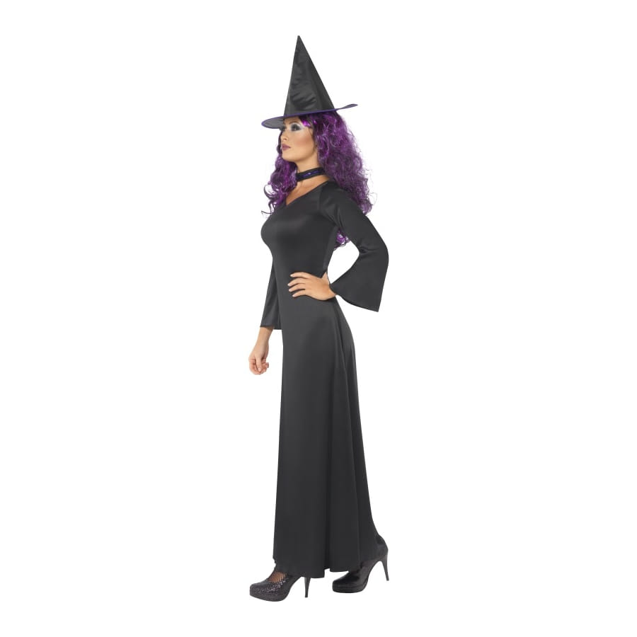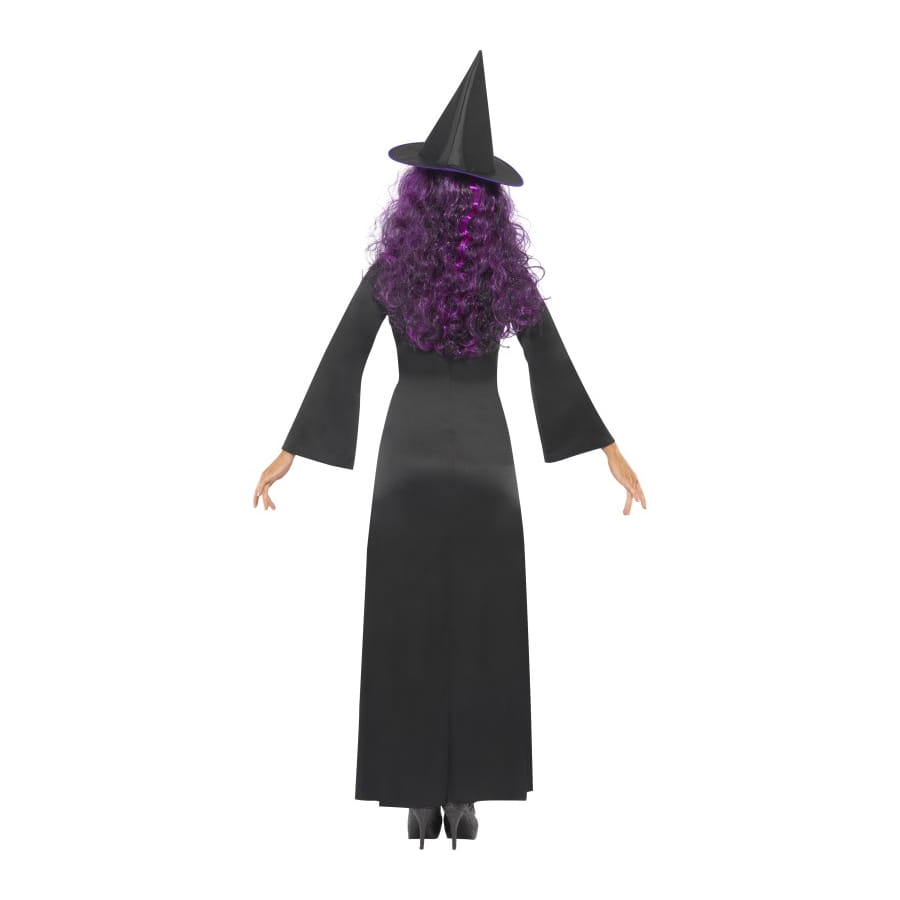 Déguisement de sorcière, pour femme, composé d'une longue robe noire. d'un chapeau et d'un collier assortis. Cet ensemble est disponible en taille S, M ou L. Avec une paire de talons, vous aurez l'air d'une méchante sorcière pour Halloween.