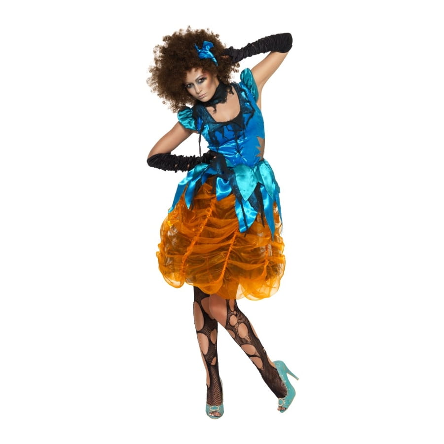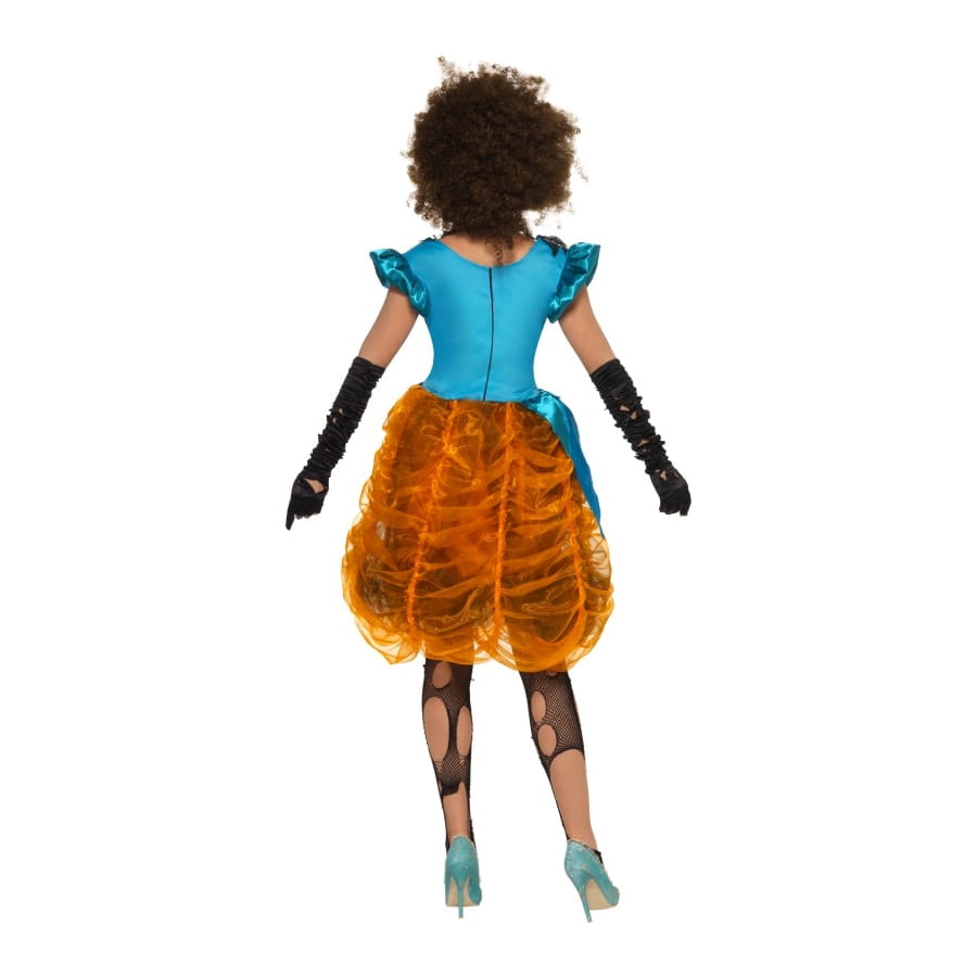 Ce déguisement de sorcière est parfait pour celle qui veulent du changement pour Halloween. Il est composé d'une robe manche ballon, il est de couleur bleu, noir et orange. La robe arrive jusqu'aux genoux. Il est aussi composé d'un collier noir.