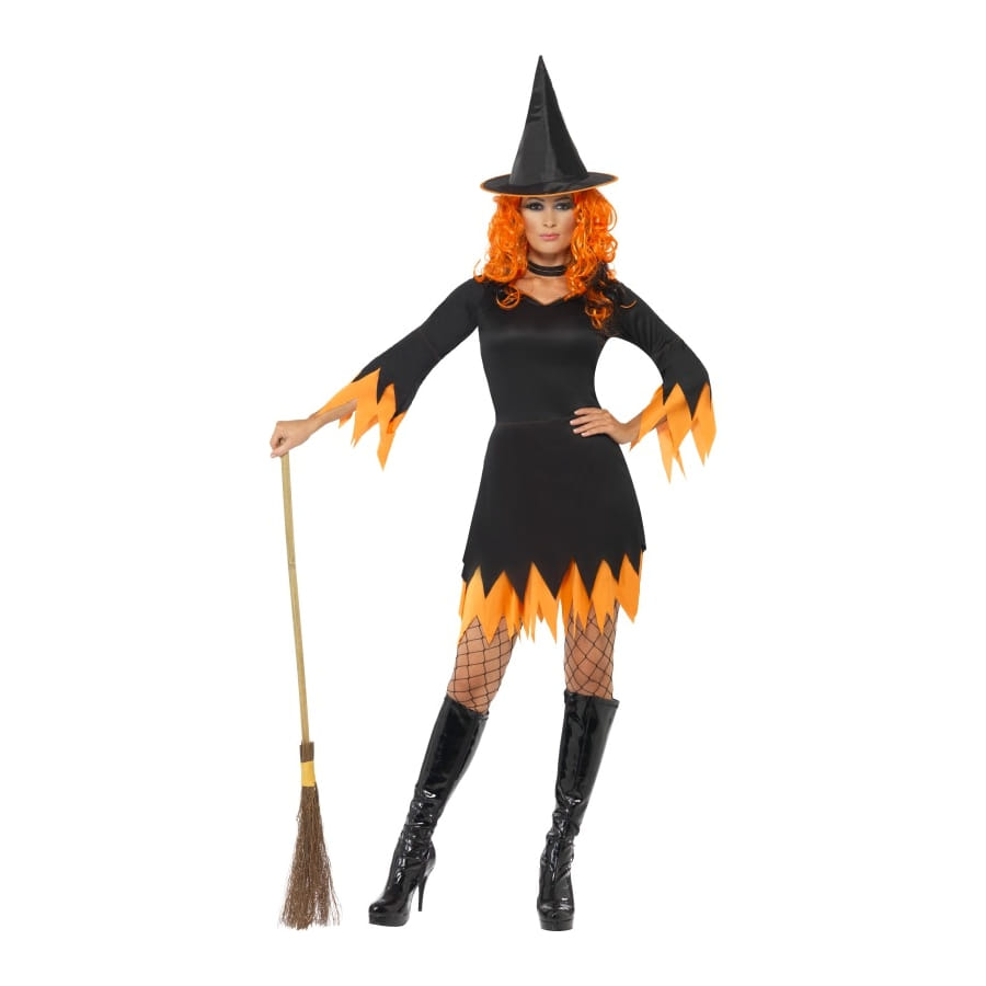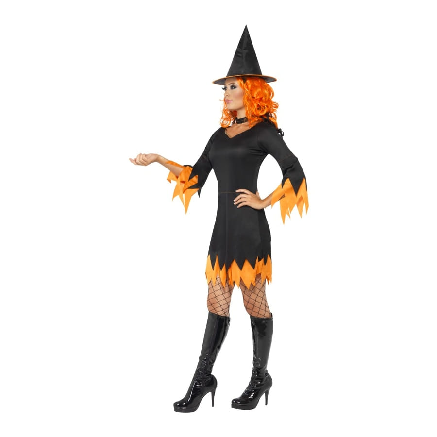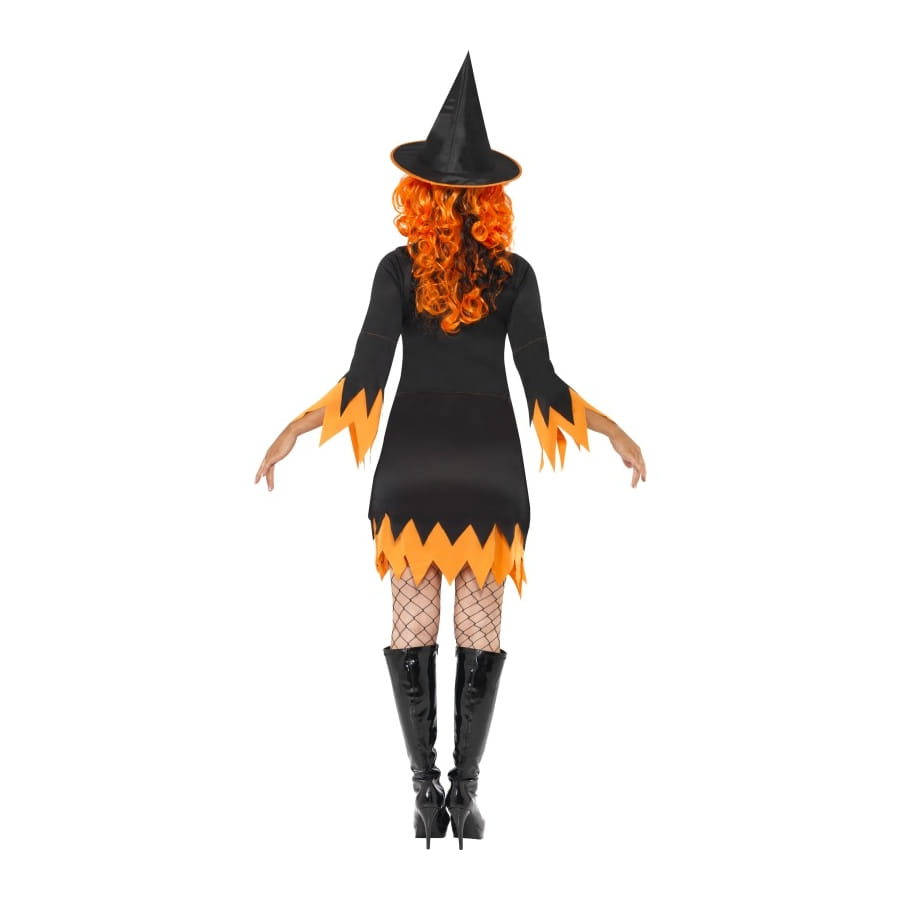 Déguisement de sorcière, pour femme, composé d'une robe noire à rebords oranges, d'un chapeau assorti et d'un collier noir. Il vous sera possible de choisir entre une taille S, M ou L lors de la commande. Ce déguisement vous ira parfaitement à l'occasion d'une soirée d'Halloween.