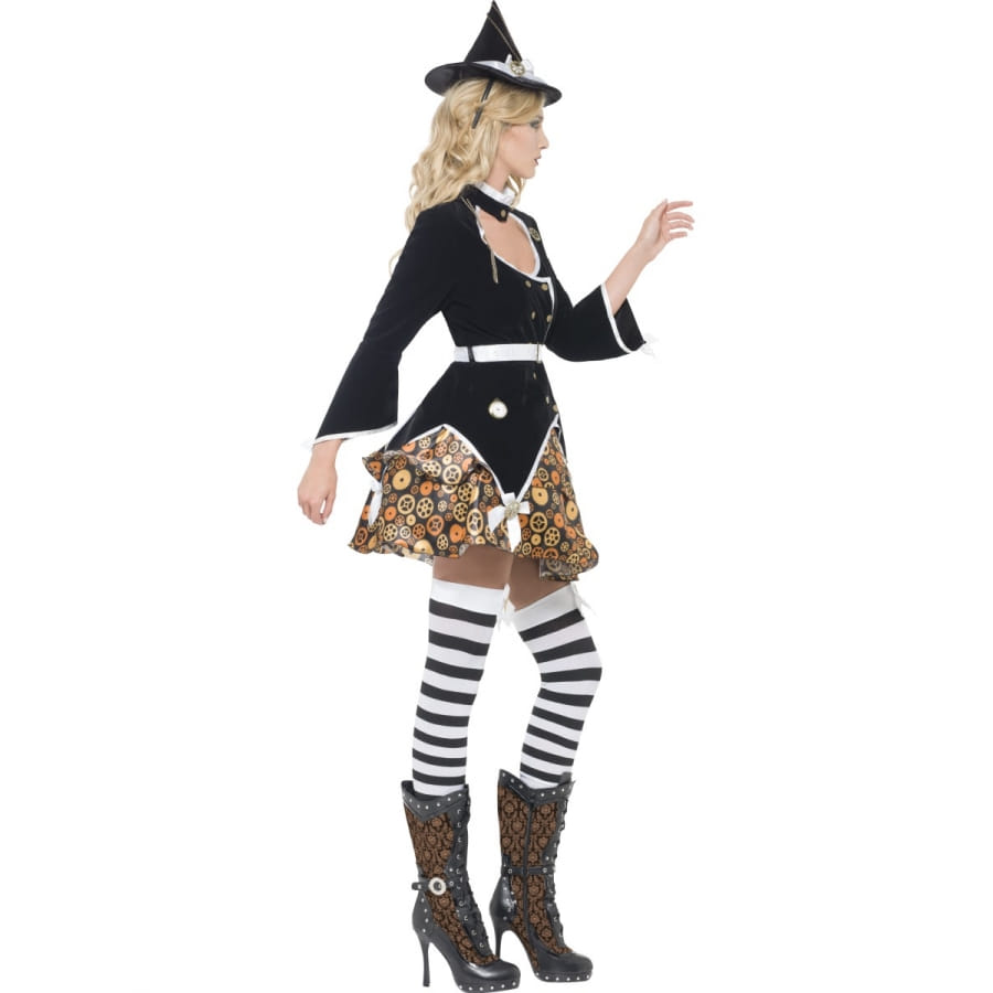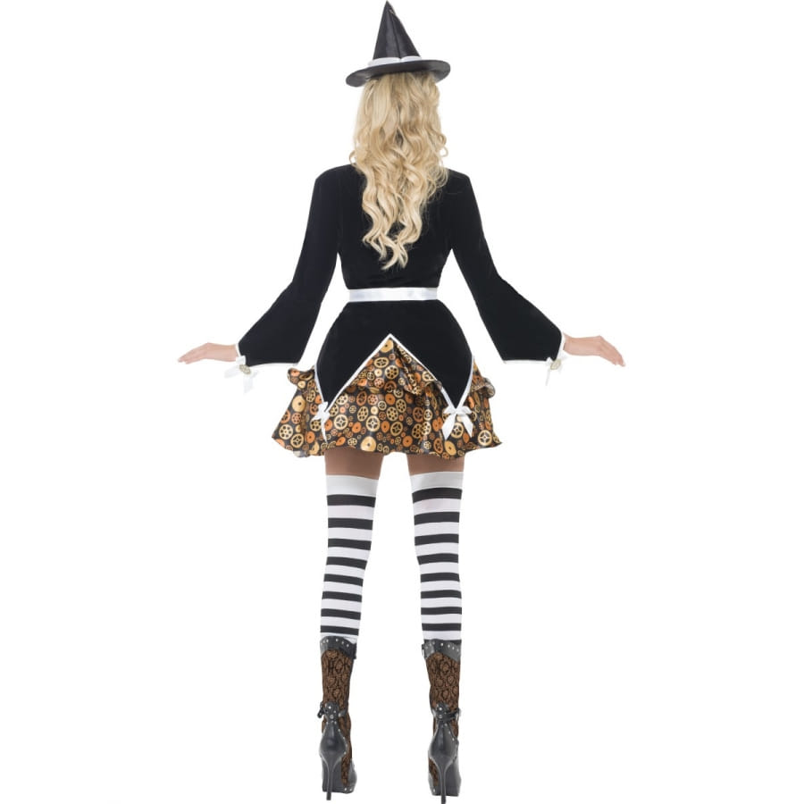 Déguisement de sorcière punk, pour femme, composé d'un chapeau pointu noir et blanc, d'une veste noire et blanche avec ceinture et d'une jupe en tutu noire imprimée de motifs orange. Le déguisement est disponible en taille S, M ou L. Adoptez un style original pour Halloween avec cette superbe tenue!