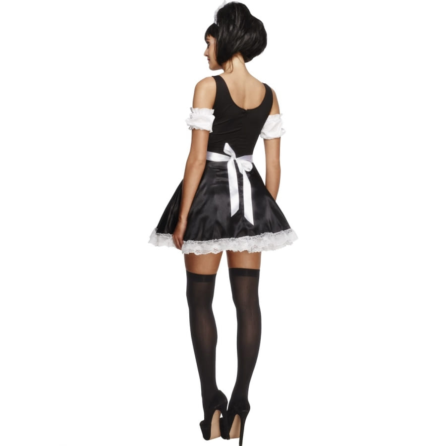 Ce déguisement de soubrette française est une robe avec décolleté. Cette robe a un petit tablier sur le devant de couleur blanc. Ce déguisement est aussi composé d'un serre-tête de couleur noir et blanc ainsi que de manches de couleur blanc. Tout le monde voudra que vous soyez leur femme de ménage avec ce déguisement.