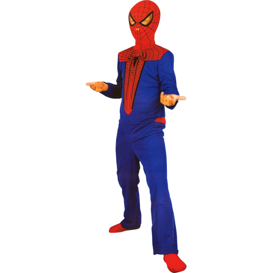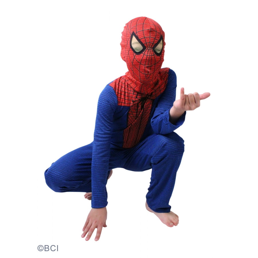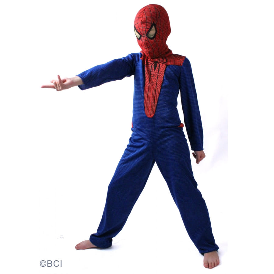 Déguisement de Spiderman sous licence de couleur rouge, noire et bleue, composé d'une combinaison et d'une cagoule. Ces deux accessoires sont disponibles pour les garçons de 3 à 5 ans, de 5 à 7 ans ou de 8 à 10 ans. Votre enfant se transformera en véritable super héros!
