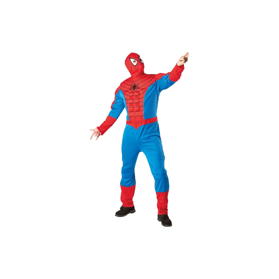 Déguisement Spiderman Muscle sous licence composé d'une combinaison bleue et rouge avec torse EVA musclé et une cagoule rouge séparée. Cet ensemble pour homme ou adolescent est 100% en polyester lavable à froid. Ne le repassez surtout pas. Transformez-vous pour une soirée en formidable homme-araignée!