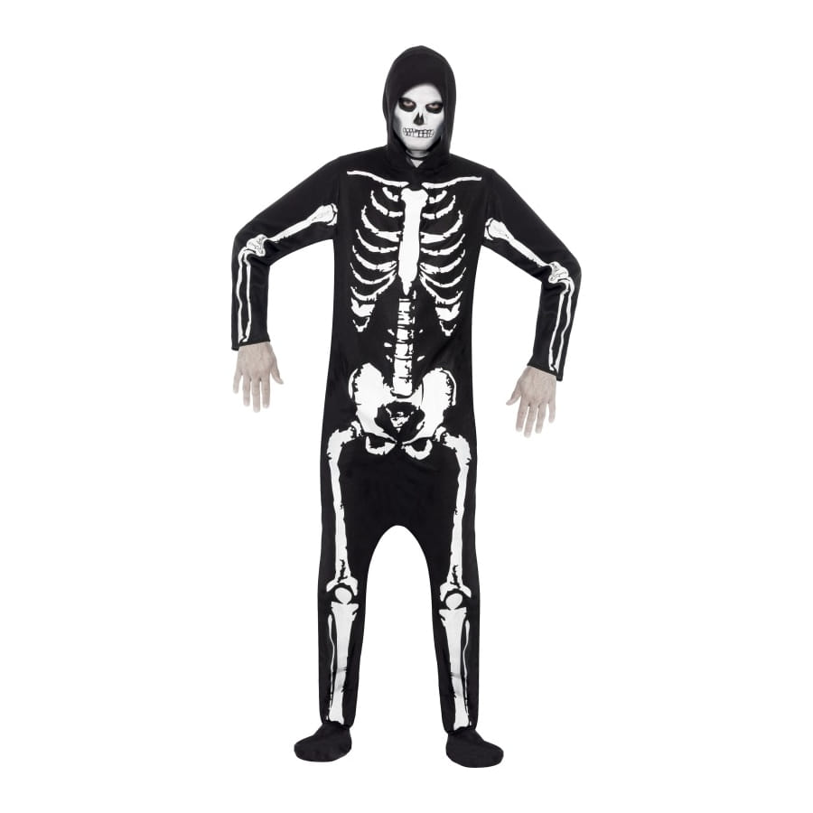 Déguisement de squelette all-in, pour homme, constitué d'une combinaison noire imprimé d'un squelette complet en blanc. Elle est disponible en taille S, M ou L. C'est le déguisement parfait pour Halloween.