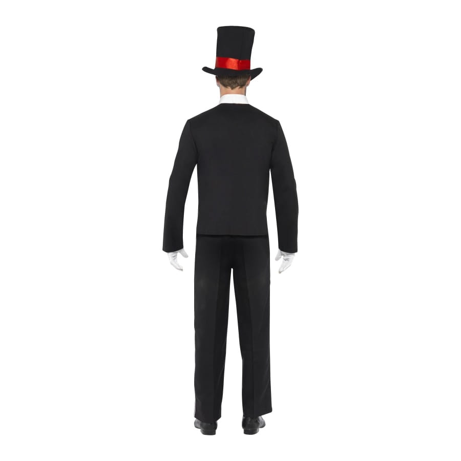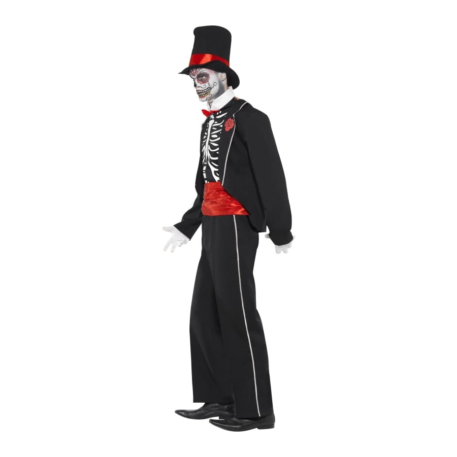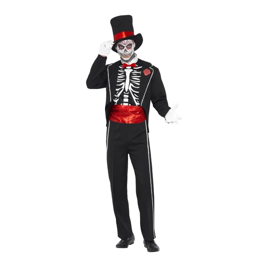 Ce costume squelette jour de la mort fera frisonner plus d'un. Parfait pour Halloween, vous pourrez incarner un squelette dans ce déguisement de taille L. Il est fait d'un chapeau de couleur noir avec bande rouge, d'une veste noir avec bande blanche, d'un top avec le dessin d'un squelette dessus.