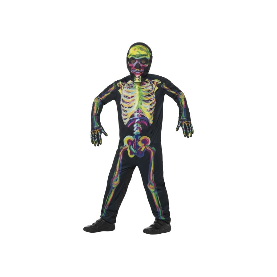 Rien de tel qu'un costume complet pour votre enfant à l'occasion de la fête d'halloween. Avec le déguisement squelette phosphorescent pour enfant, tout est complet, votre enfant n'aura plus qu'à enfiler ses chaussures et le tour est joué. En effet, ce costume compte déjà une combinaison noire avec le dessin d'un squelette humain phosphorescent. Une combinaison conçue dans une matière fluide et confortable. Pour couvrir les petites mains de votre enfant, vous aurez droit à une paire de gants noirs avec les phalanges du squelette. Il en est de même pour le masque avec une tête de mort multicolore qui accompagne l'ensemble. Le déguisement squelette phosphorescent pour enfant comme son nom l'indique est visible dans l'obscurité.