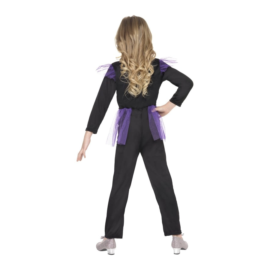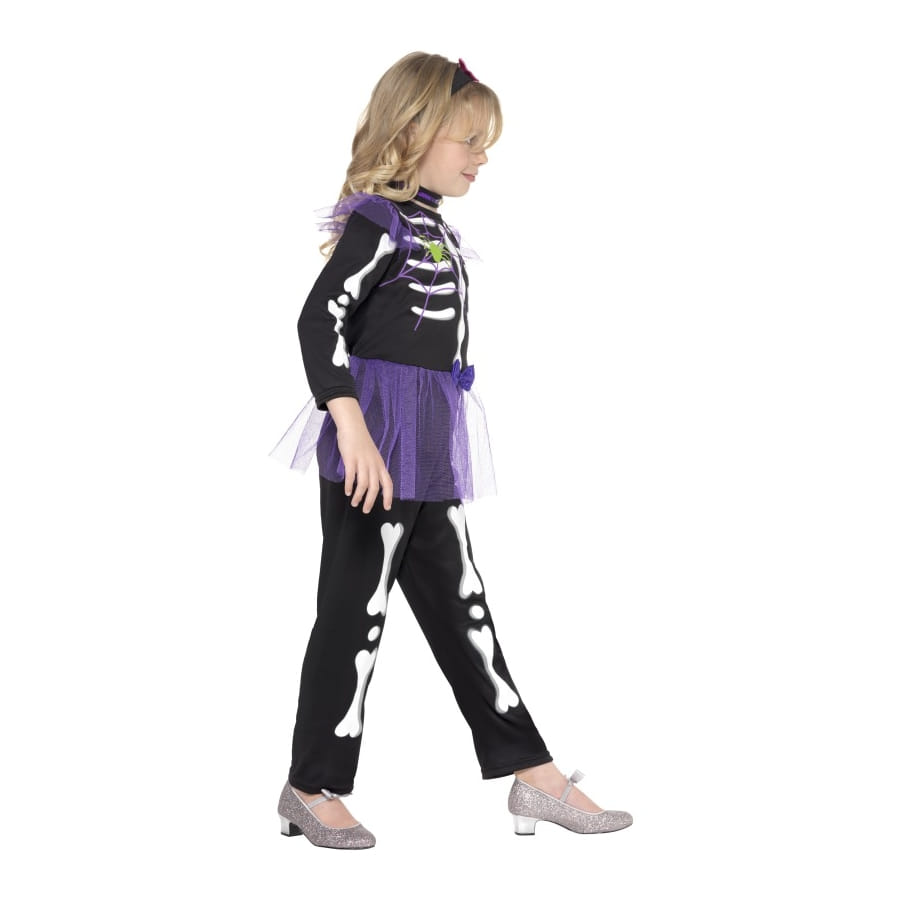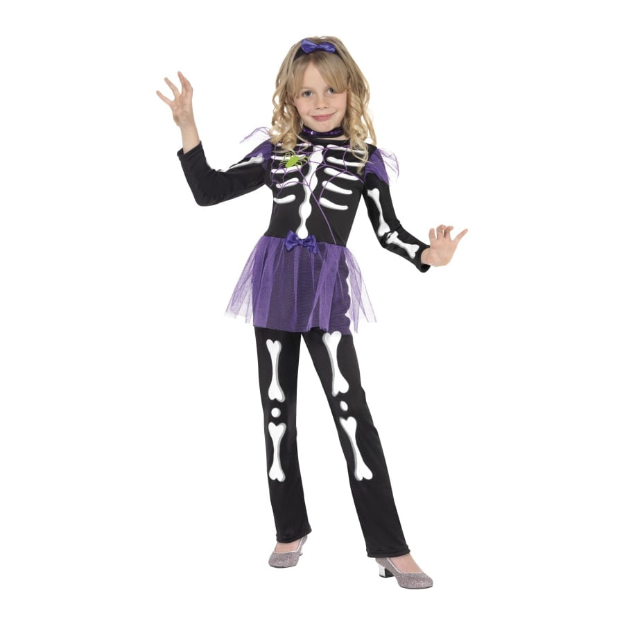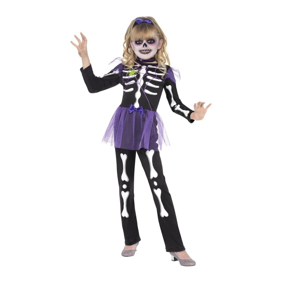 Déguisement de squelette punk, pour enfant, composé d'une combinaison, d'un serre-tête et d'un collier. La combinaison est noire avec des imprimés de squelette blancs, avec un tutu violet assorti au serre-tête et au collier. Elle est disponible en taille S, M ou L. Votre enfant sera absolument parfait pour sa collecte de bonbons lors de la nuit d'Halloween.