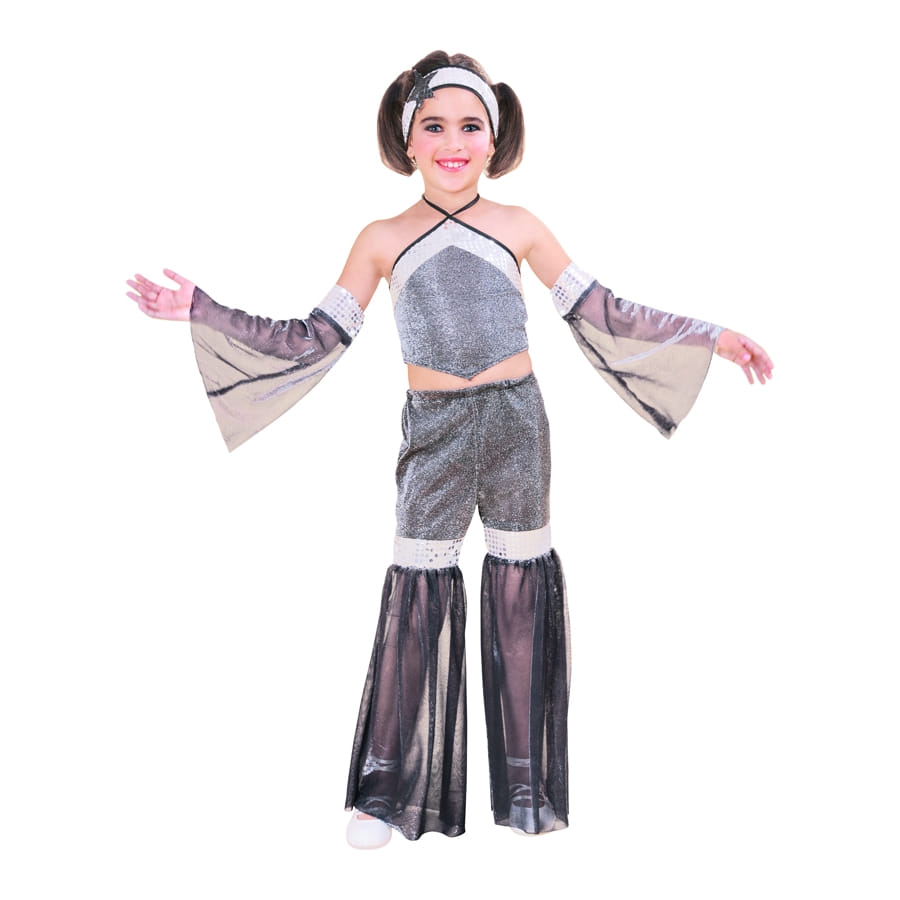 Faites de votre fille une vraie star du grand écran ! Avec ce déguisement de starlette, elle sera digne de présenter une émission télé. Elle disposera d’un joli pantalon gris dont la partie inférieure est complétée par un tissu fin et transparent. Il est assorti avec un petit top gris qui sera accompagné de manches à accrocher au niveau de l’avant bras. Elles sont également constituées de tissu transparent. Un bandeau est prévu pour créer une coiffure de rêve. L’ensemble est bien évidemment parsemé de paillettes pour un effet plus célébrité. Les tailles disponibles sont les tailles 140 (8/10 ans), 152 et 164. Avec ce style disco, votre fille sera la reine du dance floor pendant les fêtes de l’école ou les anniversaires !