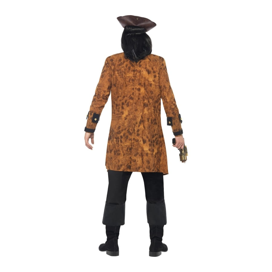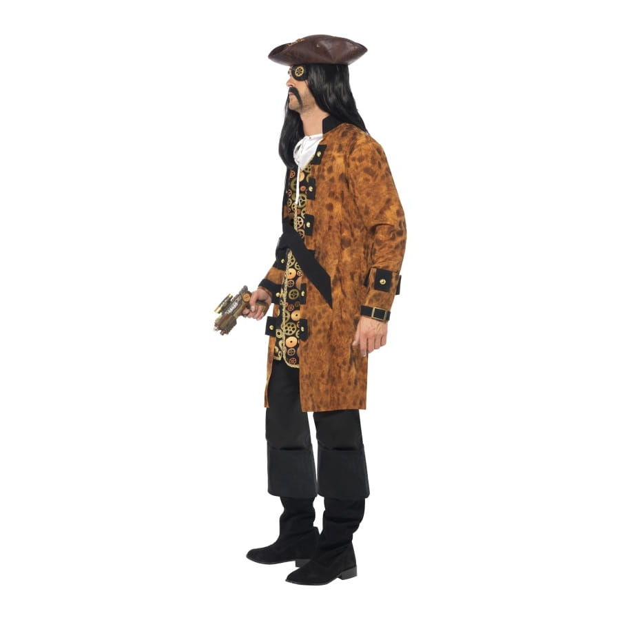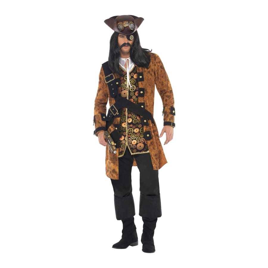 Déguisement de pirate Steampunk, pour homme, composé d'une veste brune et noire, avec faux veston assorti et d'une chemise blanche. Cet ensemble est disponible en taille S, M ou L. Adoptez un look de pirate provenant d'un monde fictif de machines et d'engrenages.