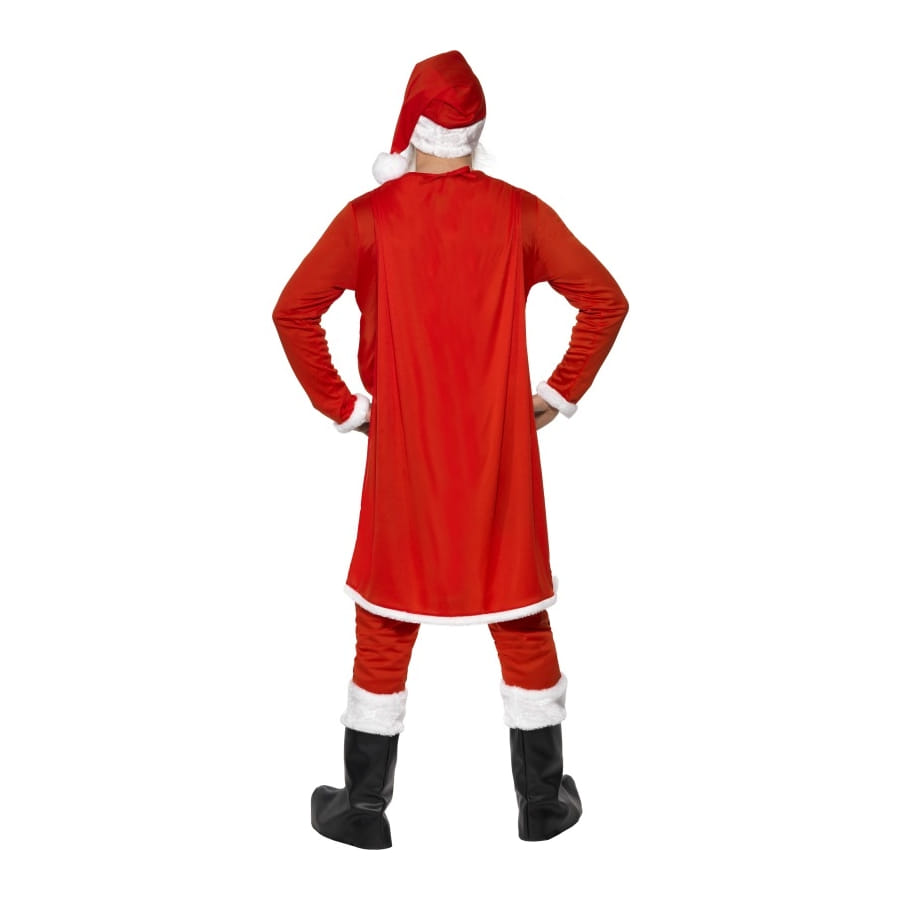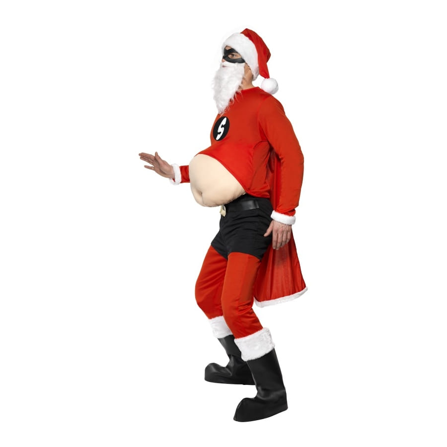 Déguisement de gros Père Noël composé d'un chapeau, d'un masque, d'une barbe, de couvre-bottes, d'une cape, d'un top et d'une ceinture. Le déguisement varie entre le rouge, le noir et le blanc. Vous pouvez le commander en taille S, M ou L. Non seulement serez-vous un Père Noël atypiqye à grosse bedaine, mais vous serez également un super-héros!