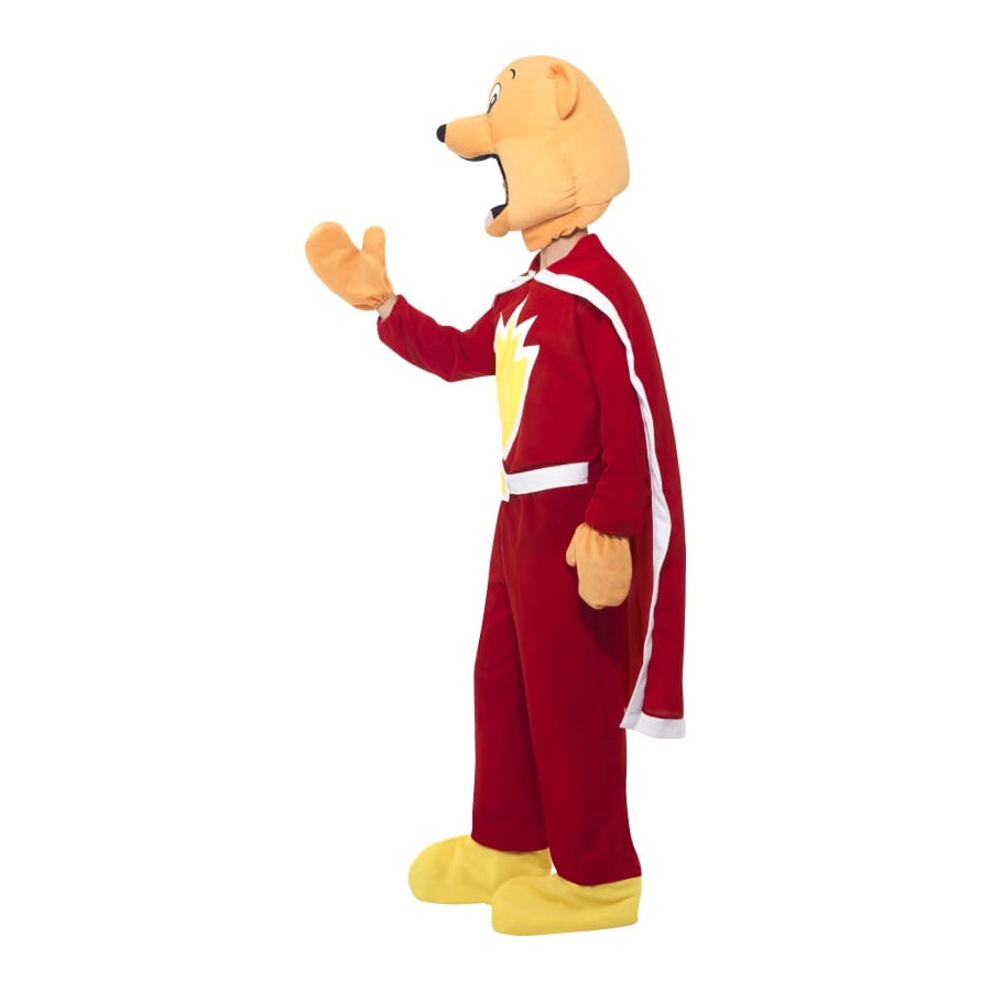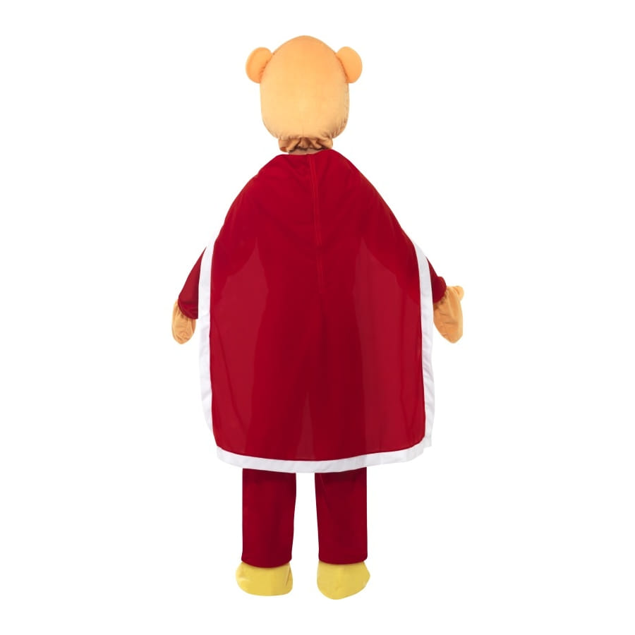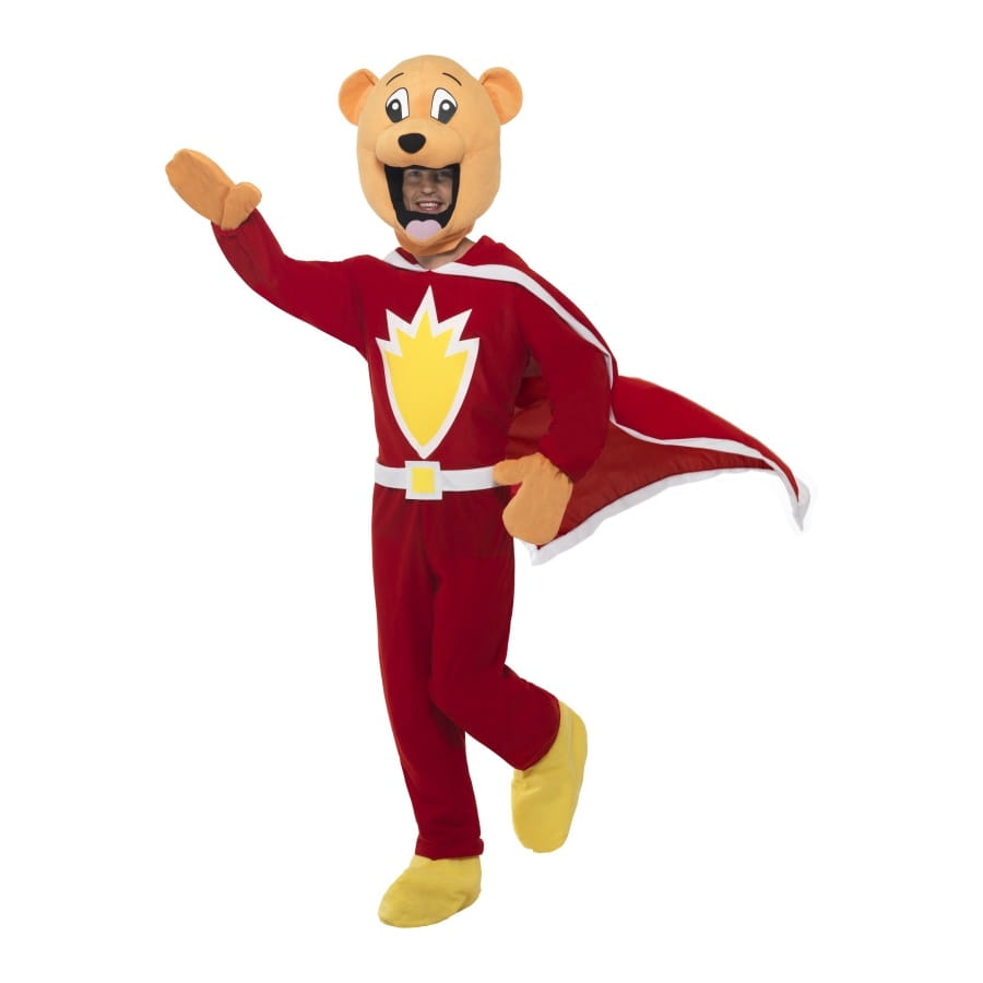 Déguisement de Super Ted, pour homme, composé d'une combinaison rouge et jaune avec des couvre-bottes assorties ainsi que d'une cape rouge et blanche, de gants jaunes et d'une cagoule en forme de tête d'ours. Ce déguisement sous licence est parfait pour une fête déguisée basée sur les dessins animés et la BD.
