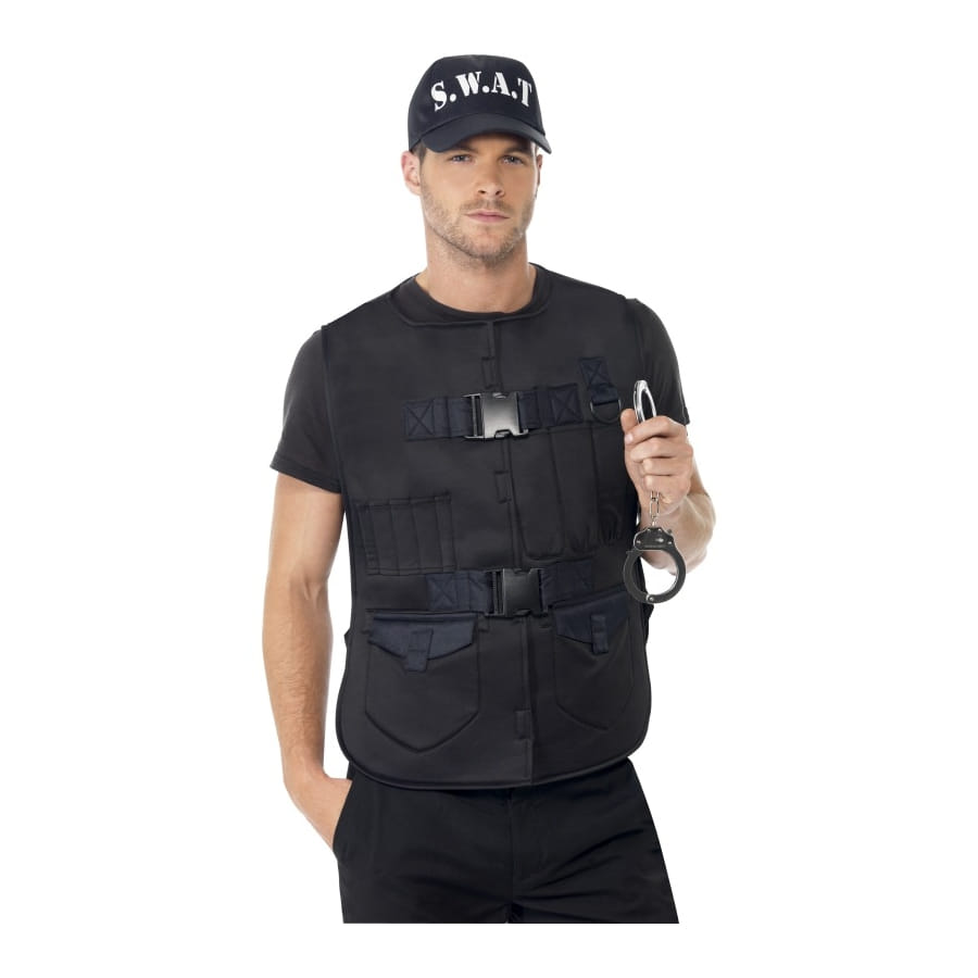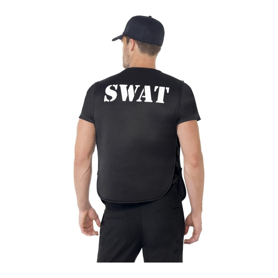 Déguisement de SWAT USA, pour homme, composé d'une veste et d'une casquette de couleur noire. La casquette est imprimé du texte "S.W.A.T" en blanc. Utilisez ce déguisement pour un festival basé sur les uniformes ou pour devenir un policier membre des forces spéciales.
