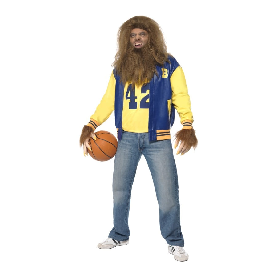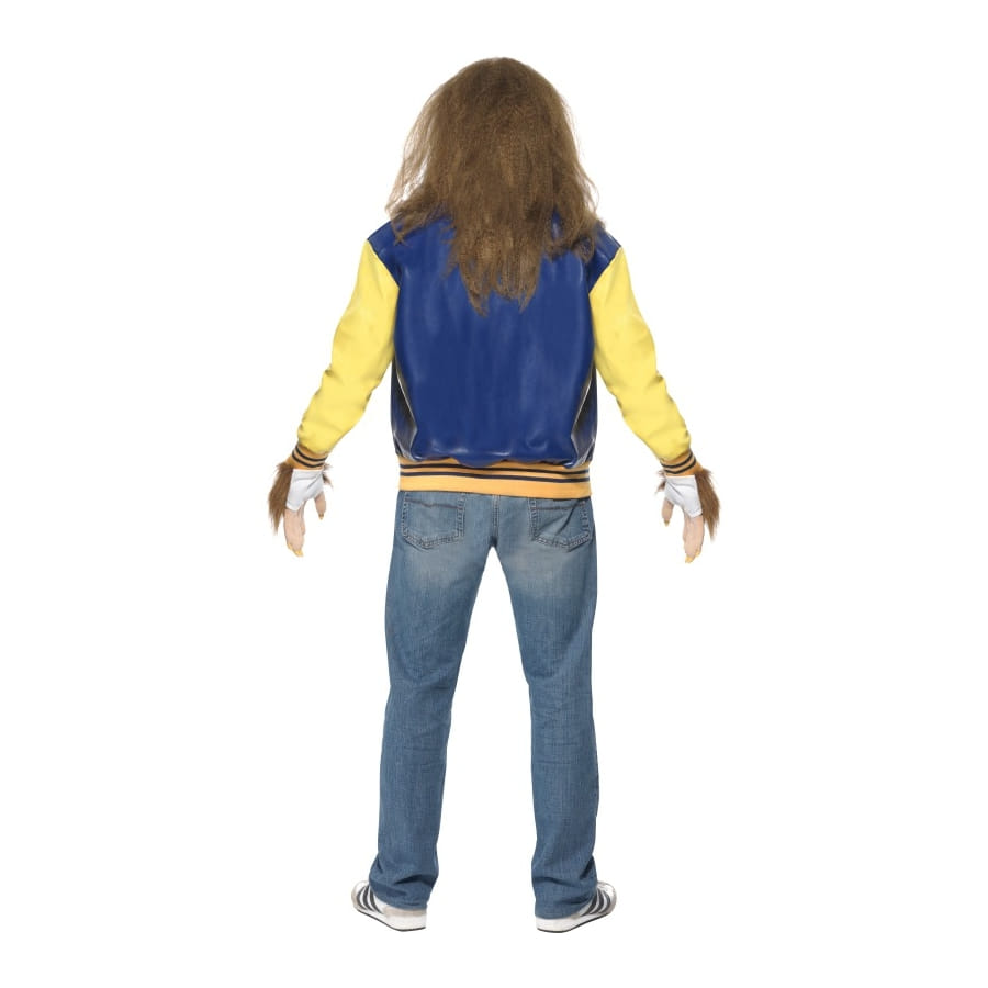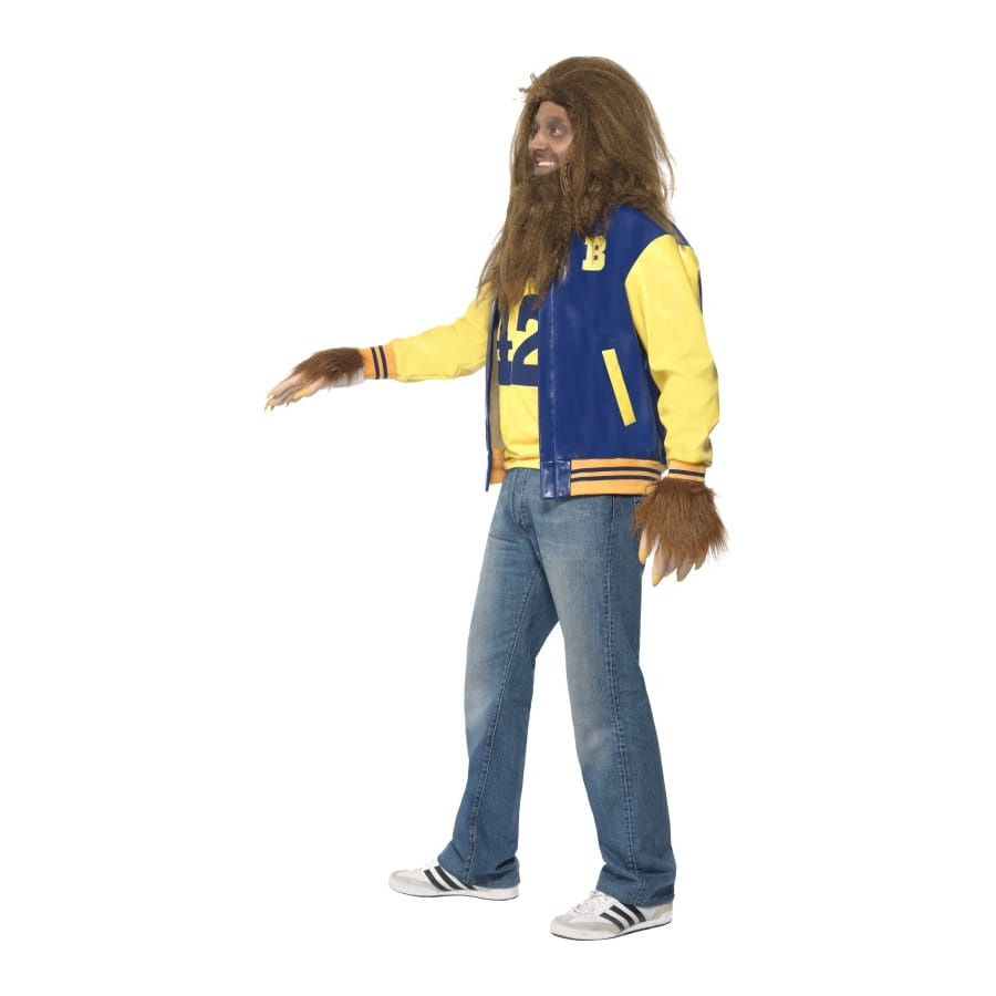 Déguisement de Teen Wolf, pour homme, composé d'une veste bleue, d'un top jaune, de gants poilus avec griffes, d'une perruque et d'une barbe poilues de couleur marron. Cet ensemble est disponible en taille S, M ou L. Incarnez un adolescent devenu loup-garou malgré lui à l'occasion d'une fête d'Halloween.