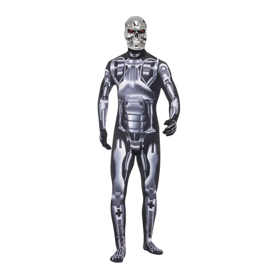 Vivez plein d'action durant cet Halloween grâce à ce costume futuriste révolutionnaire! Vous allez incarner un robot du film de science-fiction Terminator. Ce robot tueur va distraire vos amis et faire peur aux plus sensibles! Vous aurez à votre disposition cet extraordinaire costume de robot de couleur noire et argentée, dont les dessins portent à penser à un véritable squelette de robot. Un casque est aussi fourni, de couleur argentée et plutôt effrayant, avec des pupilles toutes rouges. Ce déguisement sous licence Terminator Salvation est disponible en taille L (Poitrine 106 - 110 cm) et M (Poitrine 96 - 101 cm, entrejambe 83 cm). il est lavable uniquement à sec. A l'occasion d'Halloween, votre ancienne mission : exterminer la race humaine; votre nouvelle mission : effrayer la race humaine. Costume enfilé : mission accomplie ! Et le tour est joué !