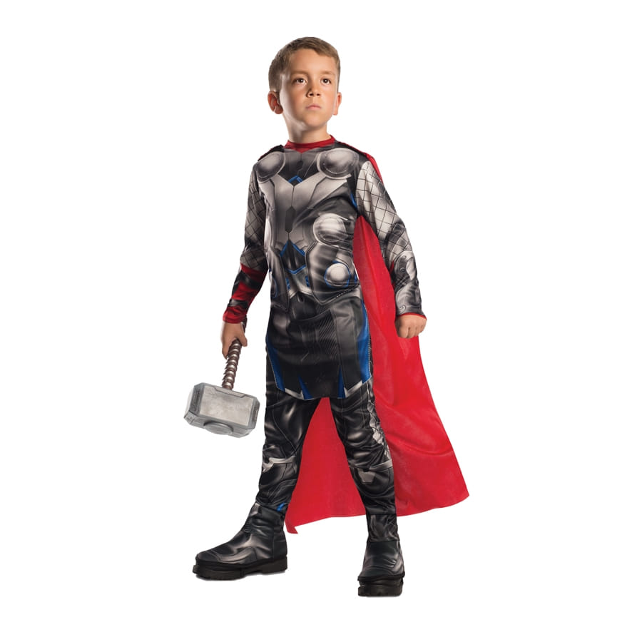 Ce déguisement Thor pour enfant est composé d'une combinaison imprimée de couleur grise qui représente l'armure de Thor, un dieu et super-héros appartenant à Marvel. Une cape rouge vient rehausser le costume d'une manière très originale (marteau non inclus). Pour ce costume pour enfant, nous vous proposons les tailles suivantes : 7/8 ans, 5/6 ans et 3/4 ans. Vous pourrez l'offrir à votre petit garçon à l'occasion de son anniversaire, il va sûrement lui faire plaisir. Pour un rendu plus efficace, retrouvez le marteau de Thor sur notre section d'accessoires de déguisement !