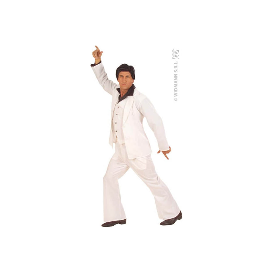 Déguisement John Travolta pour homme inspiré du film "Saturday Night Fever". Cet ensemble est composé d'une chemise, d'un col noir avec gilet attaché, d'une veste et d'un pantalon avec fermeture zip. L'ensemble est blanc sauf pour le col qui est noir. Vous serez la star de la soirée!