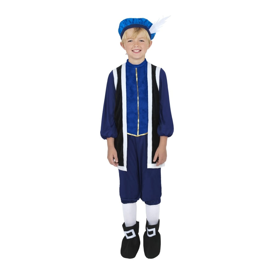 Déguisement de Tudor, pour enfant, composé d'un top, d'un pantalon et d'un chapeau de couleur bleue, noire et blanche. Le top est orné d'une fine bordure dorée et le chapeau d'une plume blanche. Vous pourrez choisir la taille de cet ensemble au moment de votre commande entre un S, un M ou un L. Il permettra à votre enfant de se déguiser en personnage de la série "Les Tudors" ou en personnage médiéval.