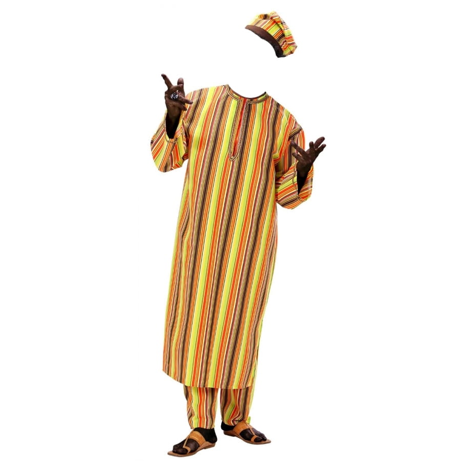 Pour une fête sur le thème des pays du monde, ce déguisement tunique africaine lignée multicolore sera parfaitement adapté. L'ensemble est formé d'une longue tunique dont la longueur va jusqu'à mi-jambe, avec de longues manches et une encolure tunisienne. Elle est décorée sur les manches et l'encolure par un galon. Le pantalon est maintenu par un élastique à la taille et la coiffe est bordée d'une bande de tissu marron foncé. Ce déguisement se caractérise par son tissu imprimé de grandes rayures verticales de couleurs vives, avec les couleurs rouge, orange, marron et jaune qui prédominent. Il est confortable à porter car le tissu est léger.