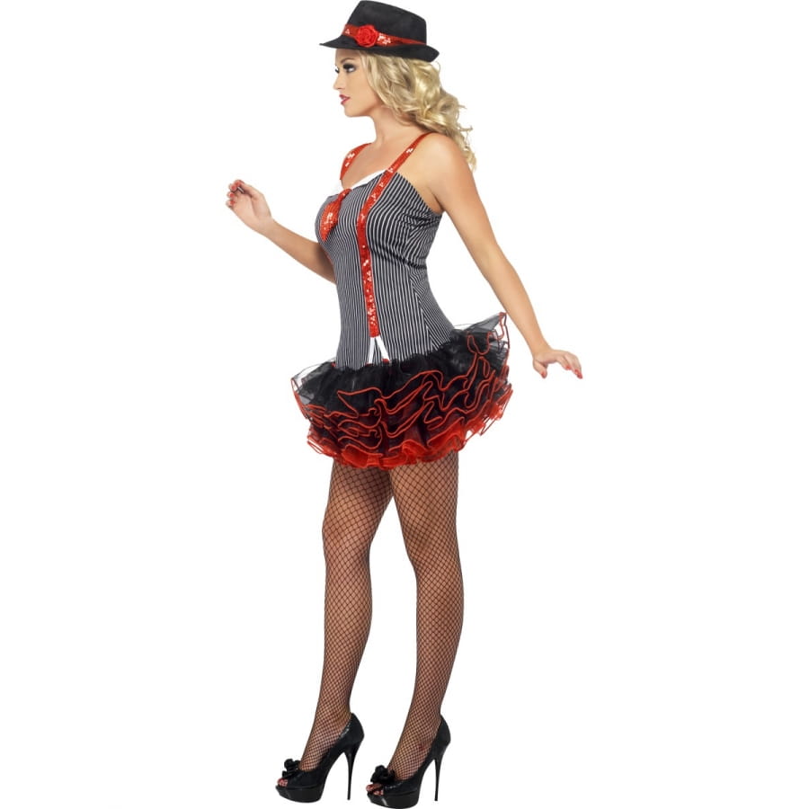 Ce déguisement de gangster sera parfait si vous partez à une fête ayant pour thème mafia ou encore sexy ou charme. Vous serez magnifique et redoutable dans ce déguisement, il est composé d'une robe tutu de couleur grise, noir et rouge avec des bretelles rouge ainsi que d'une cravate rouge.