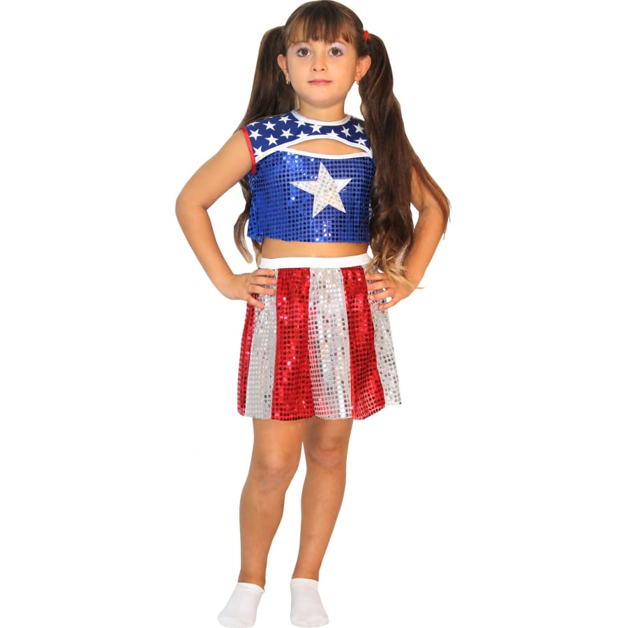 Costume de "Starlette US", pour fille, composé d'un top pailletté bleu et blanc et d'une jupe à paillettes à rayures blanches et rouges. Cet ensemble est disponible en taille de 116, 128, 140, 152 ou 164 centimètres. Cette tenue est parfaite pour un anniversaire ou un évènement sportif pour enfants.