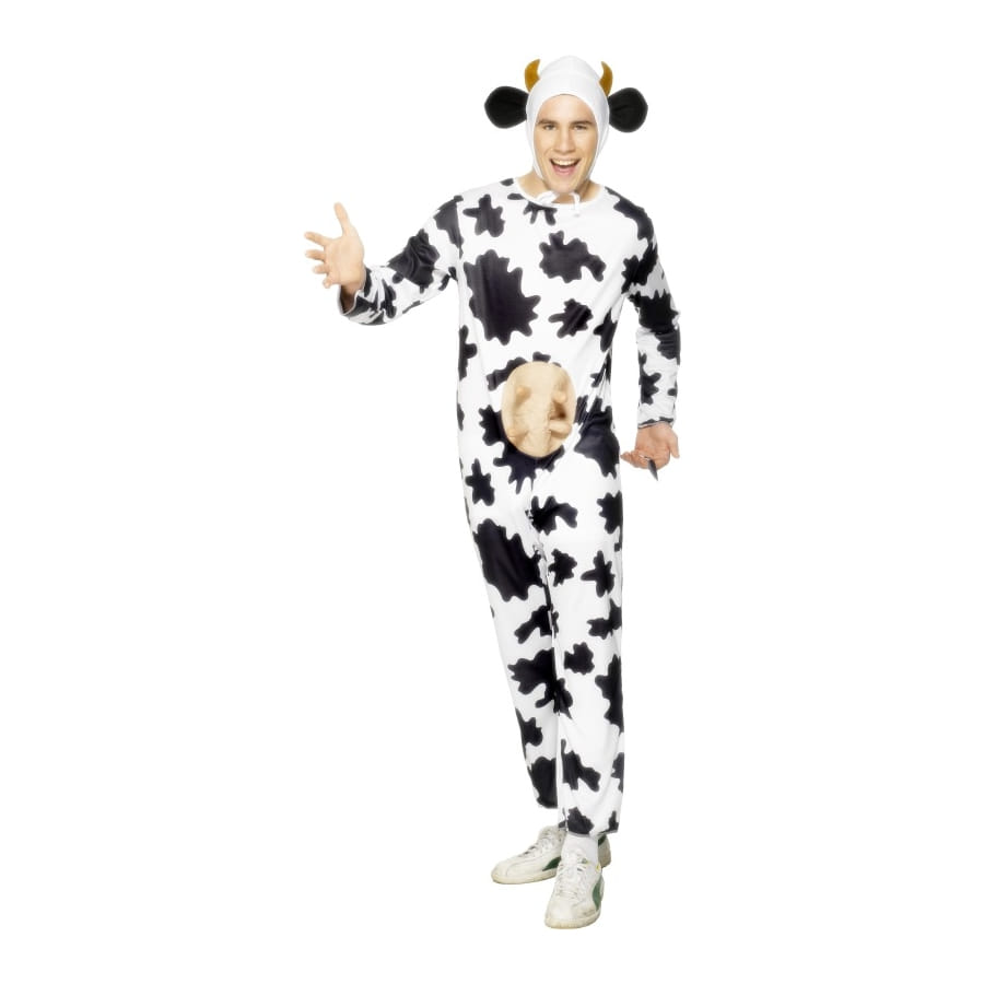 Vous partez à une fête ayant pour thème les animaux pourquoi ne pas revêtir ce déguisement de vache. Ce déguisement manche longue est de couleur blanc tacheté de noir avec des pies de couleurs beige au niveau du ventre. Il a aussi un capuchon avec deux oreilles noir sur le coté ainsi que deux cornes sur la tête.