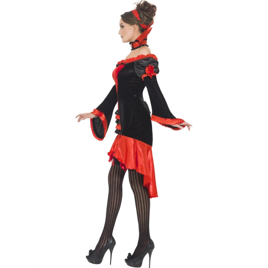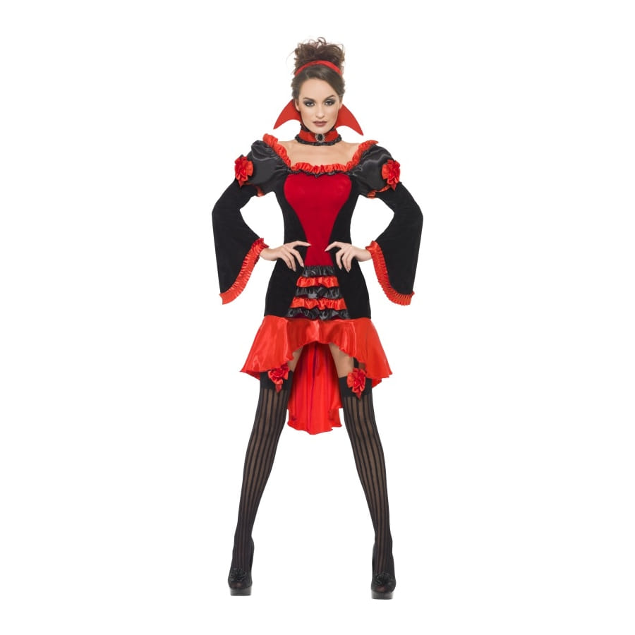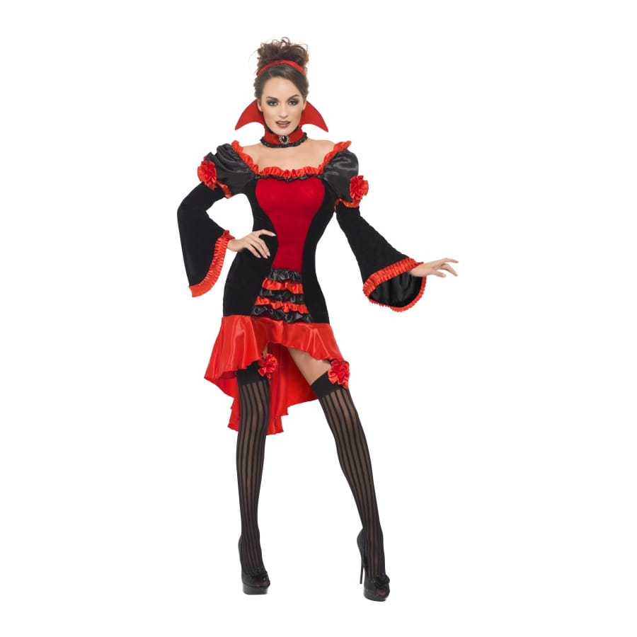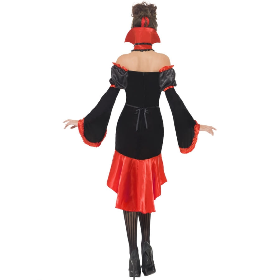 Déguisement de femme vampire composé d'une robe rouge et noire, d'un serre-tête rouge et d'un collier rouge et noir avec dentelle et col. La robe est ornée d'une multitude de volants et de noeuds. Cet ensemble est disponible en taille S, M ou L. Ajoutez-y des collants pour parfaire un look de femme vampire gothique à l'occasion d'Halloween.