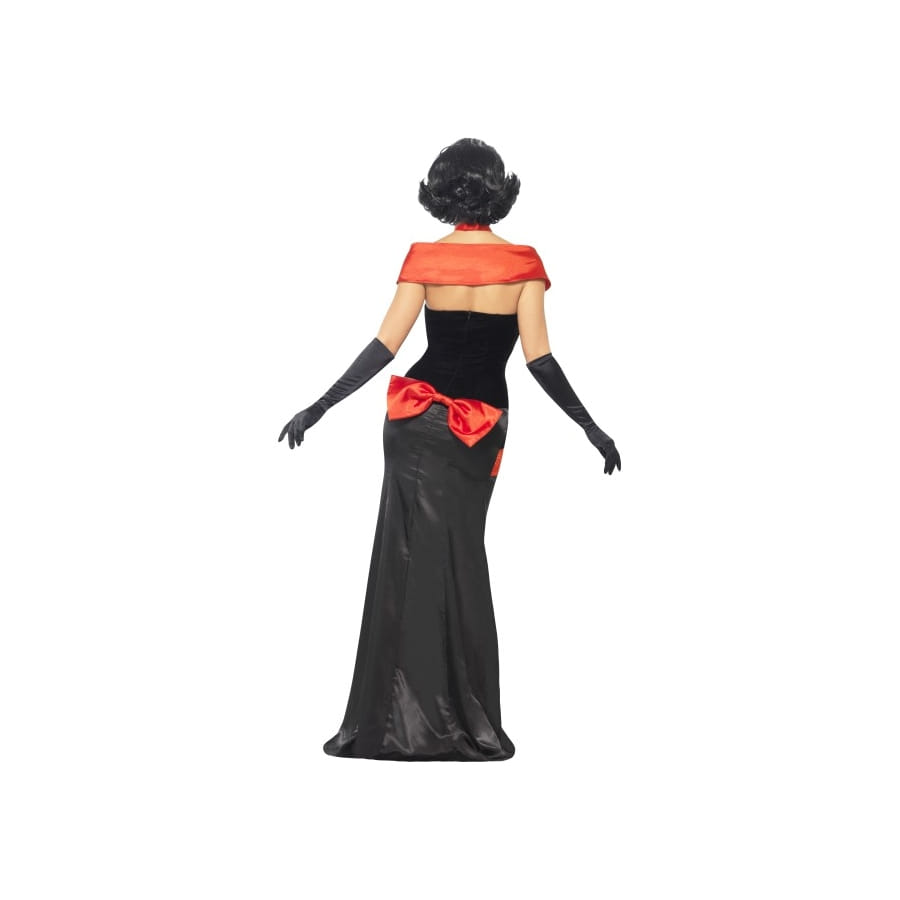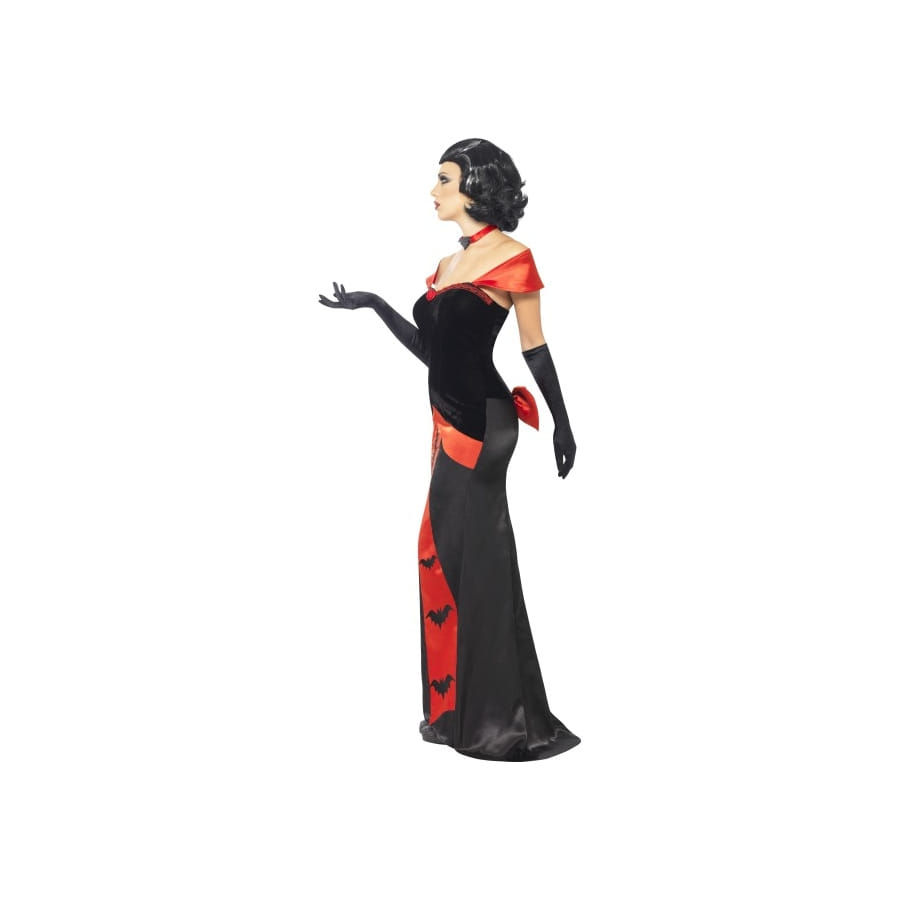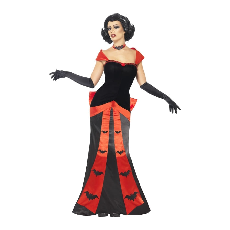 Déguisement de vampire glam, pour femme, composé d'une longue robe noire et rouge, de gants noirs et d'un collier rouge avec broche argenté. La robe est en forme de corset noir, avec manches rouges et long jupon rouge et noir orné de chauve-souris. Choisissez entre un S, M ou L au moment de votre commande. Optez pour une allure de vampire chic et glamour avec ce déguisement!