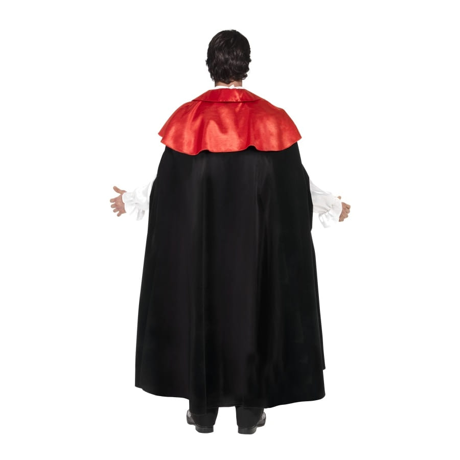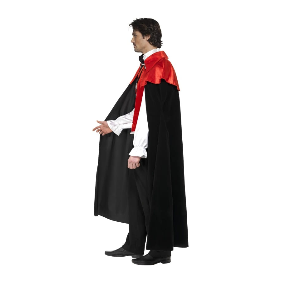 Déguisement de vampire de manoir gothique, pour homme, composé d'un top rouge et blanc en satin, attaché à une magnifique cape noire et une cravate assortie. Il est disponible en taille S, M ou L. Il fera de vous un vampire riche, élégant et classe, de quoi séduire sans difficulté votre prochaine victime!