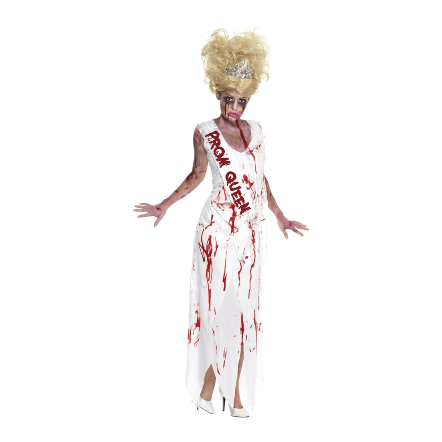 Déguisement de reine de bal vampire, pour femme, composé d'une longue robe blanche tâchée de sang et cousue avec une écharpe imprimée des mots "Prom Queen" en sang. C'est un déguisement simple, mais qui suffira à donner des frissons à vos amis. Choisissez la taille de la robe entre un S, un M ou un L.