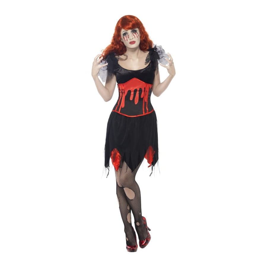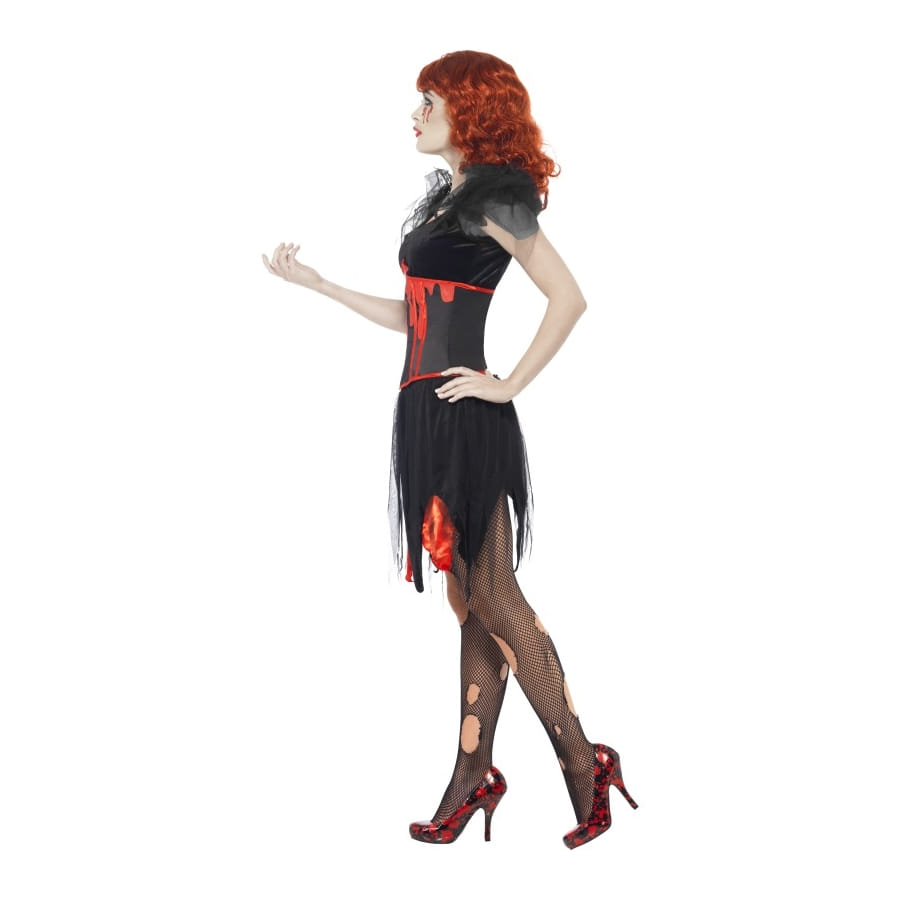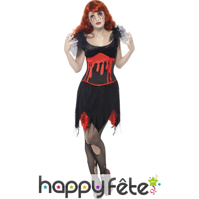 Déguisement de vampire, pour femme, composé d'une robe noire et rouge et d'un corset assorti, tous deux disponibles en taille S, M ou L. Le corset est imprimé de sang dégoulinant qui donnera fera de vous une véritable vampire assoiffée de sang.