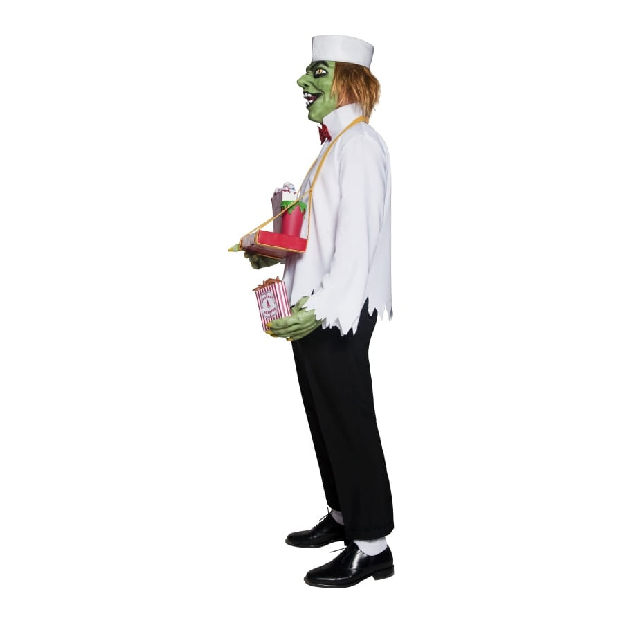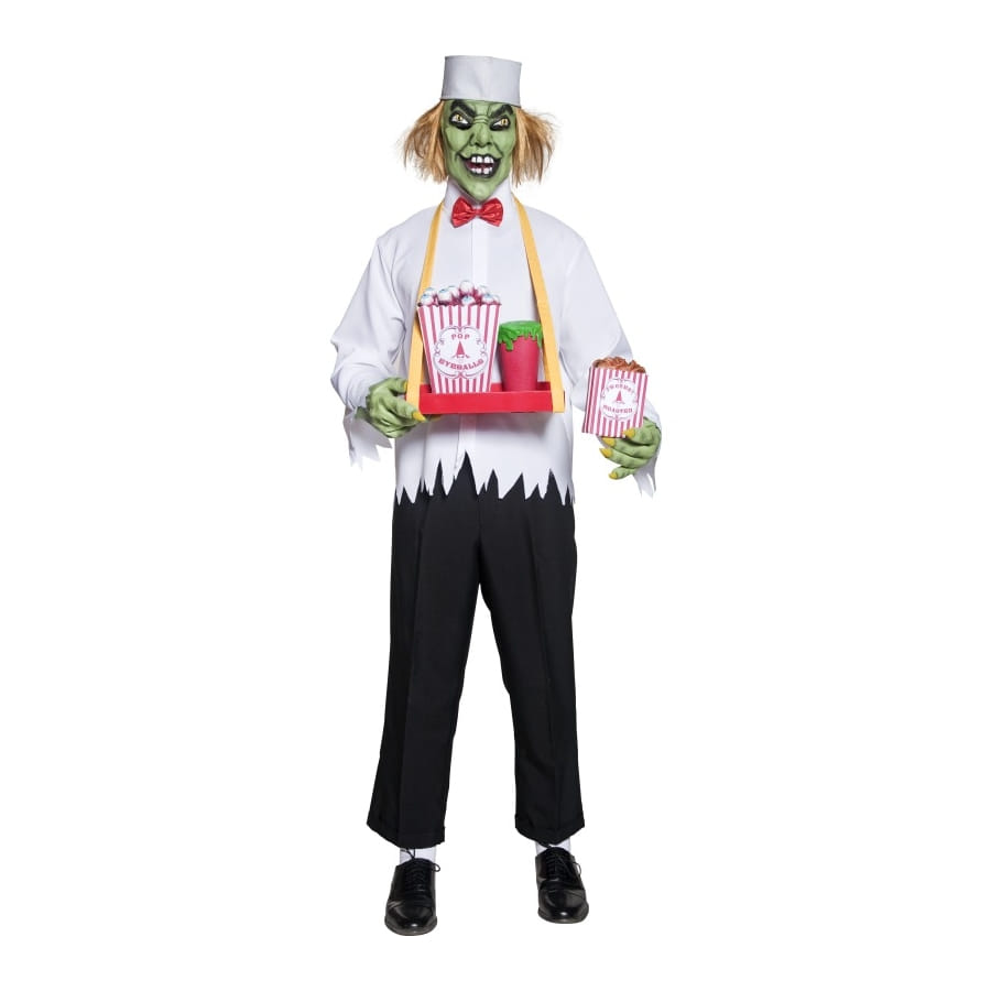 Déguisement de vendeur zombie, pour homme ou femme, composé d'un top blanc avec noeud rouge, d'un masque de zombie vert avec cheveux, de gants verts et d'un plateau de pop-corn. Le tout est disponible en taille S, M ou L. Enfilez ce déguisement pour Halloween et offrez des pop-corns à vos amis et admirez leur réaction!