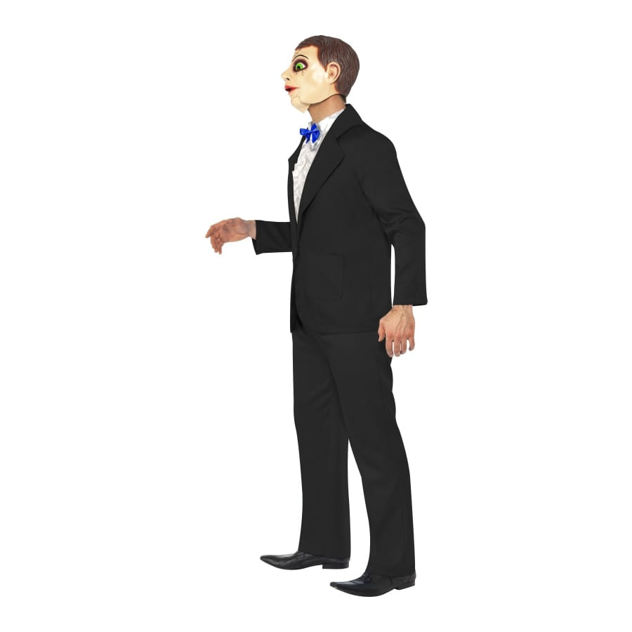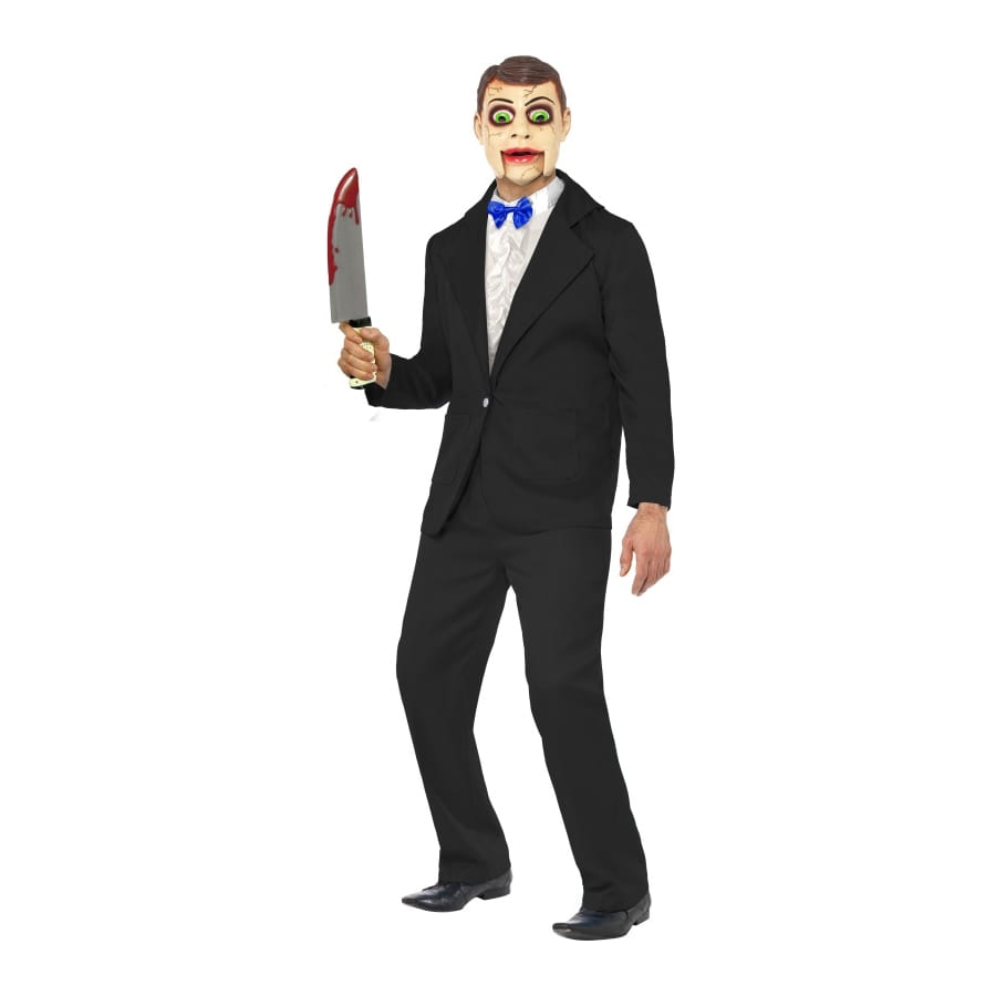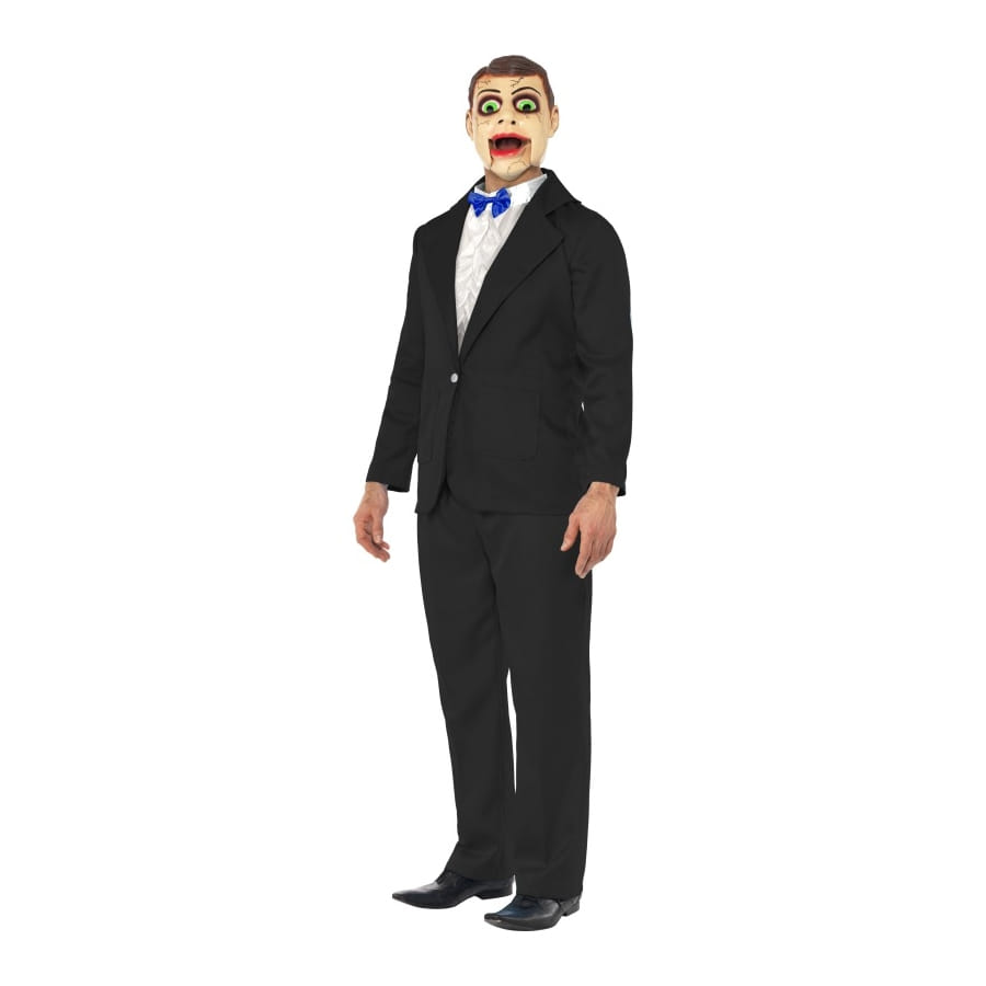 Déguisement de poupée ventriloque, pour homme, composé d'une veste noire, d'une fausse chemise blanche, d'un noeud papillon bleu et d'un masque de marionette. Le tout est disponible en taille S, M ou L. Rappelez-vous vos films d'horreur de votre enfance et enfilez ce costume pour faire peur à la nouvelle génération! Inspiré du film Dead of Night (au coeur de la nuit).