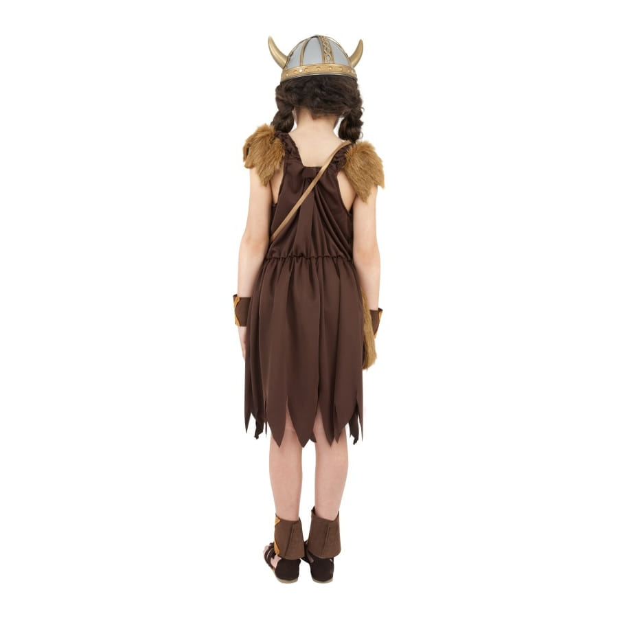 Déguisement de Viking de couleur marron, pour fille, composé d'une robe et d'une paire de cache-poignets. La robe arrive aux genoux et est fabriqué en matière imitant la fourrure. Elle est disponible en taille S, M ou L. Votre enfant pourra se transformer en mini-Viking.