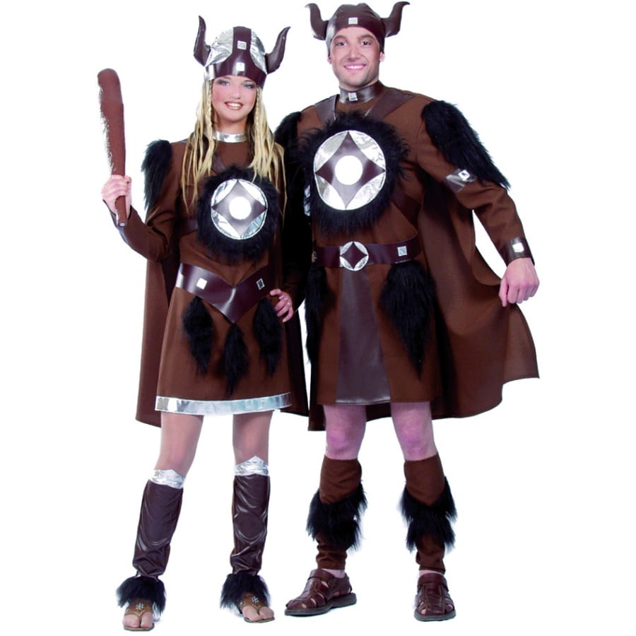 Déguisement de Viking de couleur marron et noire, pour homme, composé d'une robe, d'une ceinture, de guêtres et d'une coiffe. Cet ensemble est disponible en taille 50-52 ou 54-56. Il est parfait pour une fête basée sur un thème médiéval.