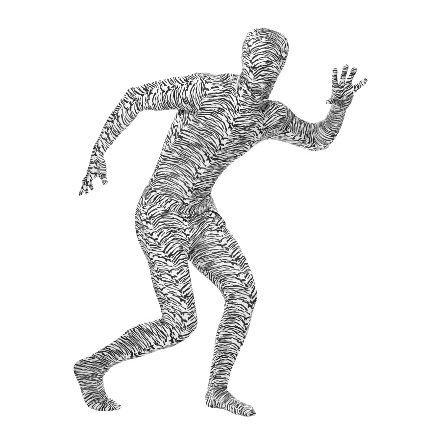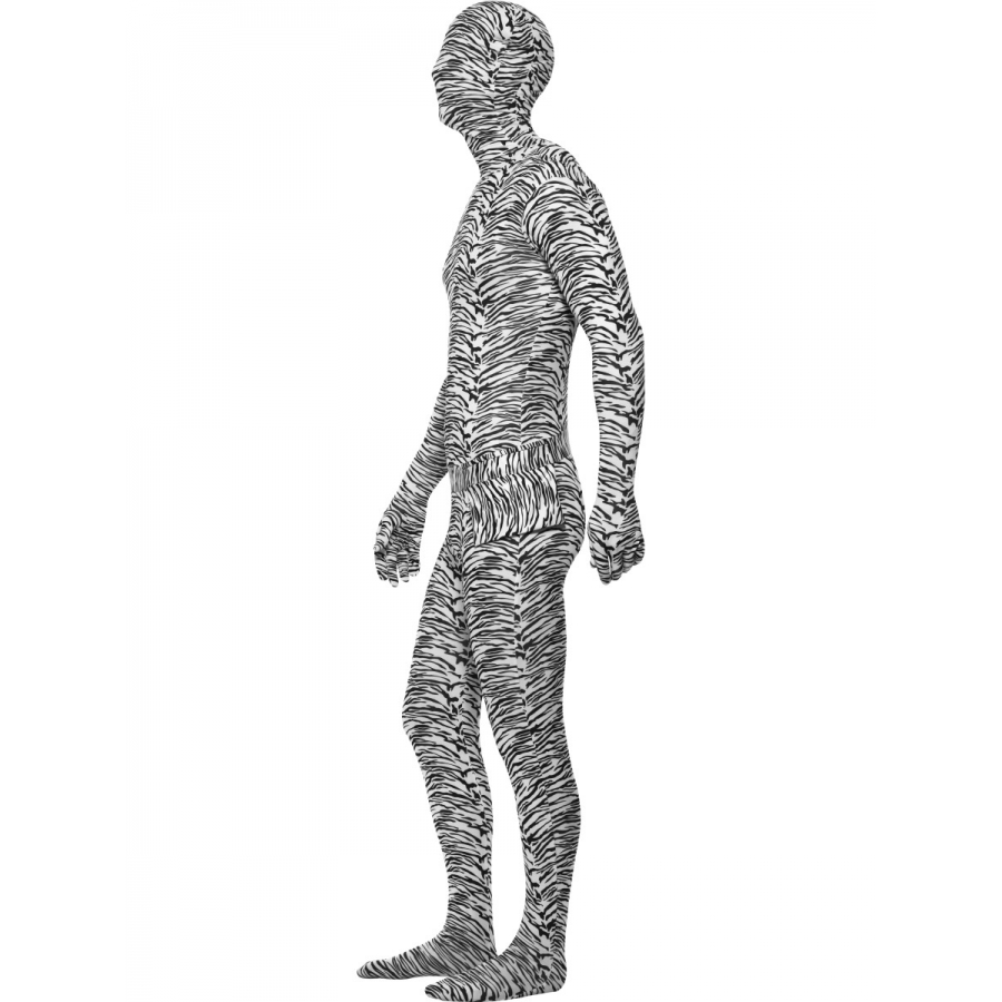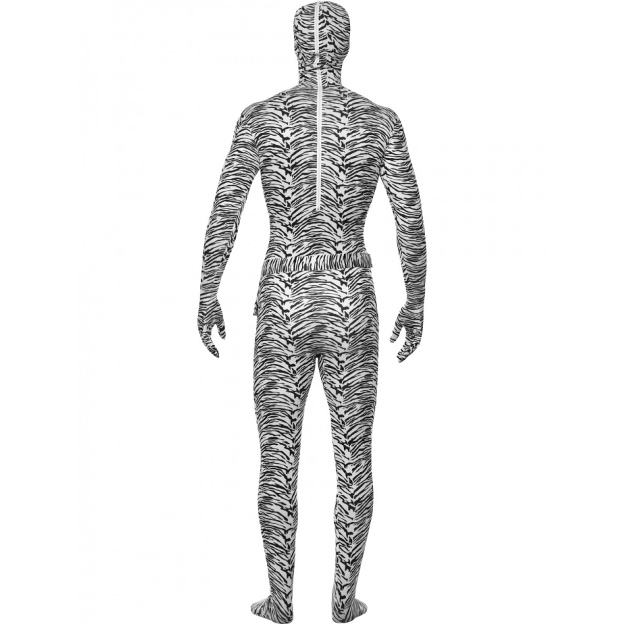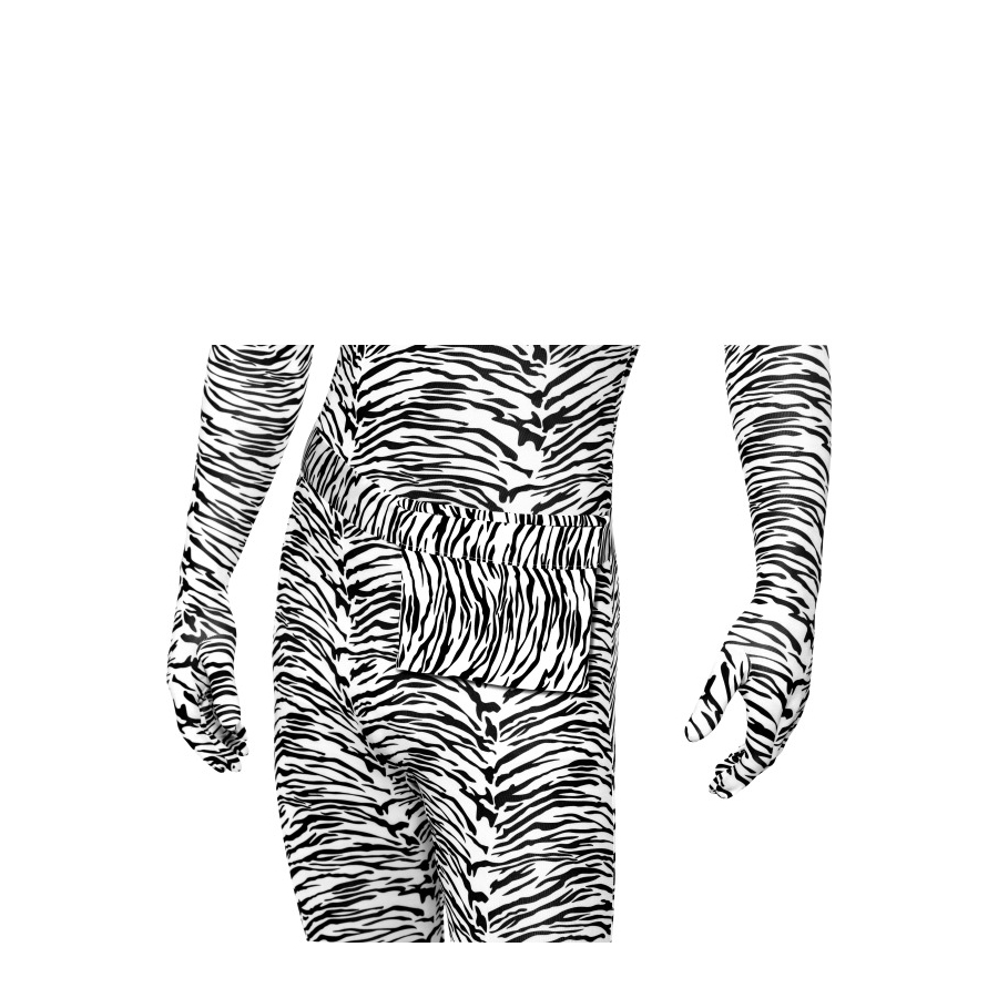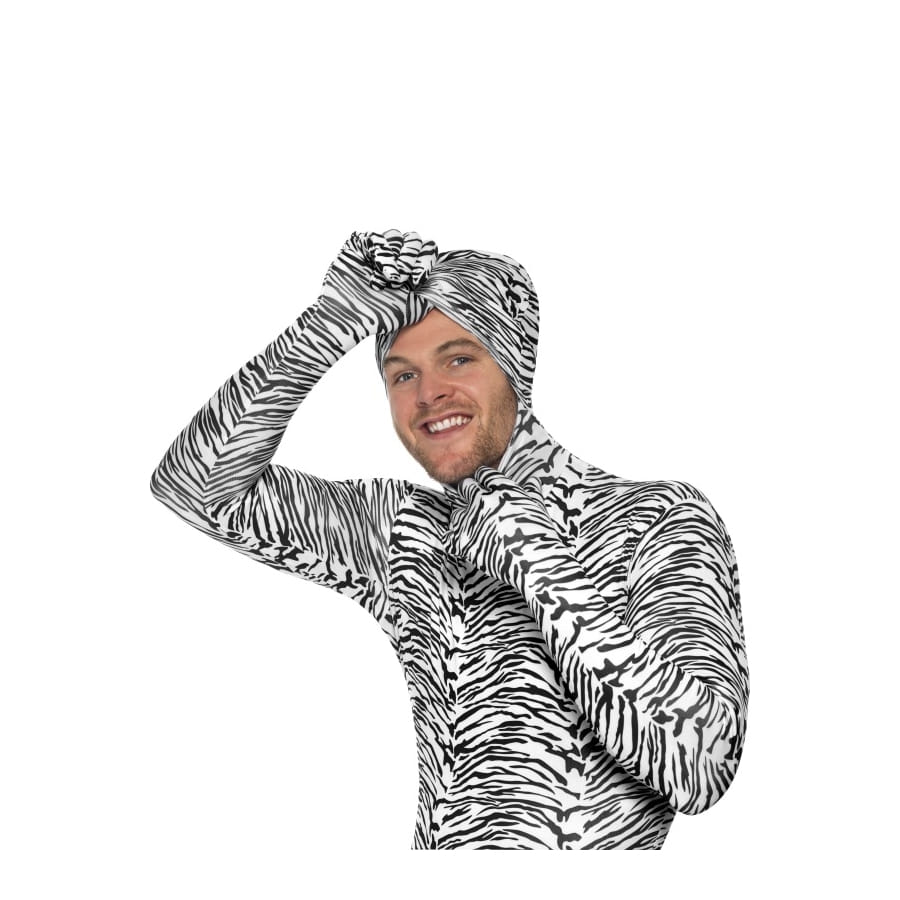 Déguisement de zèbre de couleur blanche et noire, pour homme, constitué d'une combinaison seconde peau disponible en taille M, L ou XL. Cette combinaison épousera parfaitement la forme de votre corps et fera de vous un zèbre atypique.