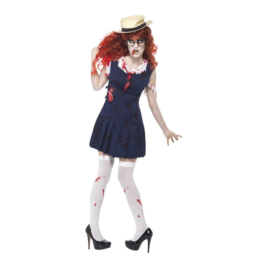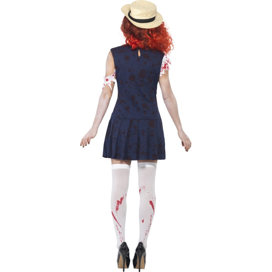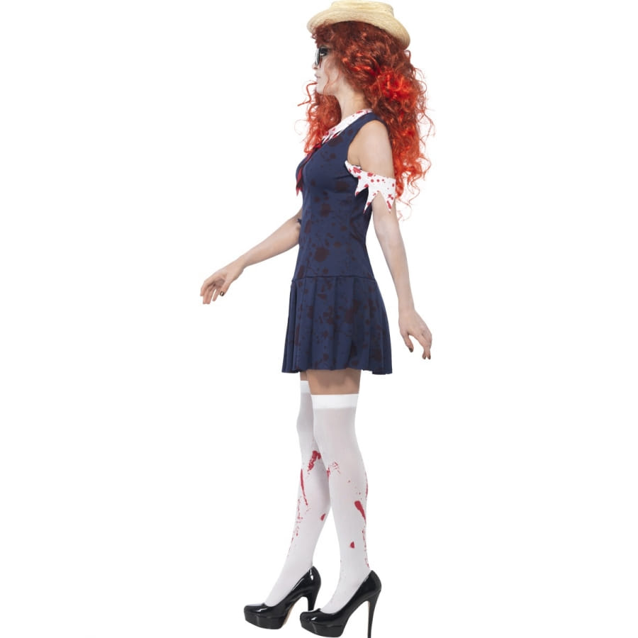 Vos années lycée vous manquent, Mesdames? Il est possible de retrouver les doux souvenirs de cette belle époque, pendant Halloween. Déguisez-vous en étudiante. Mais puisqu'une simple étudiante ne pourra pas faire peur, nous vous proposons ce costume Zombie étudiante High School. Il est composé d'une robe bleu-marine simple, où la jupe est plissée, et d'un chapeau de paille avec un bandeau noir. L'ensemble est à mettre avec de hautes chaussures à talons, un petit maquillage macabre et des taches de sang partout rendront votre déguisement plus effrayant. Vous pourriez agrémenter votre costume de petites lunettes d'intello, de chaussettes blanches etc, tout cela dans le but de bien jouer le jeu. Les tailles disponibles sont : S avec une taille de robe entre 36 et 38, M avec une robe de taille 40 à 42 et L correspondant à une robe de taille 44 à 46. Nettoyage à sec uniquement.