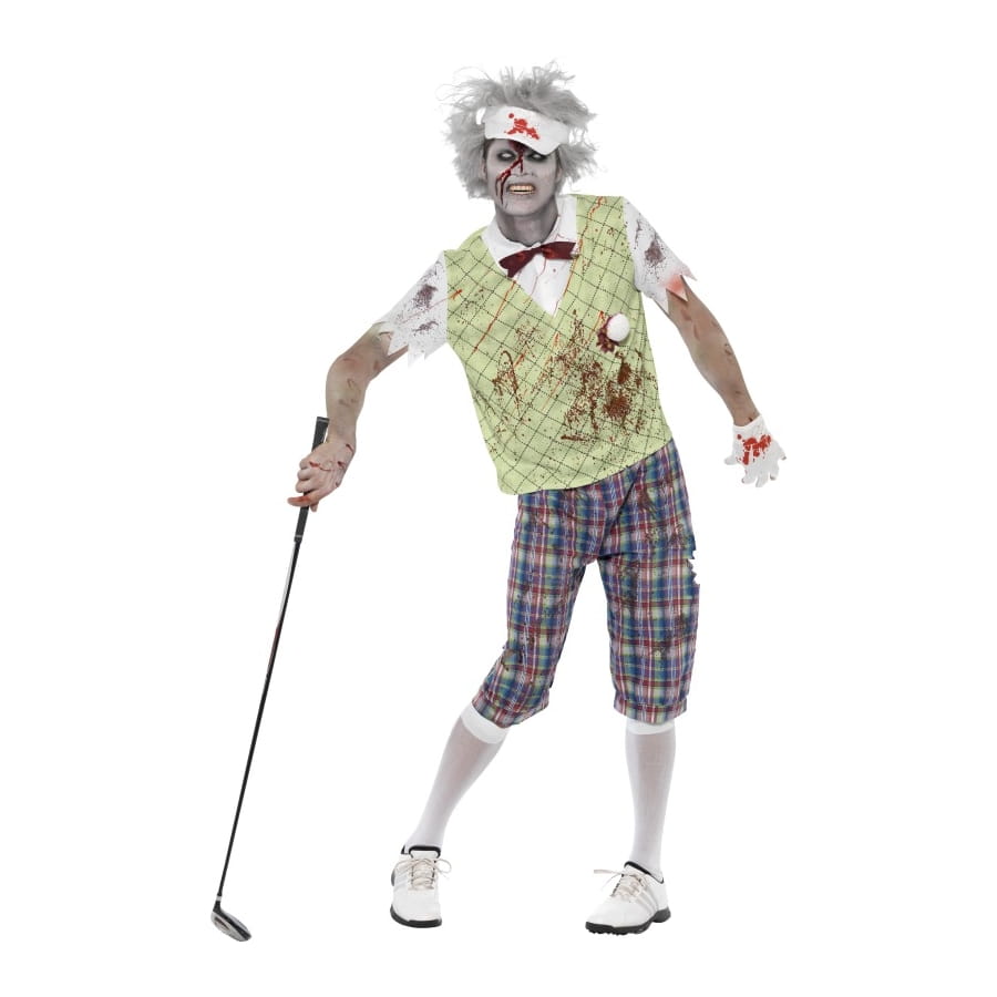 Déguisement de zombie golfeur, pour homme, composé d'un veston vert, d'une casquette blanche, d'un noeud papillon rouge, d'un pantalon à carreaux et d'un gant blanc. Tous les accessoires sont déchirés et tâchés de sang. L'ensemble est disponible en taille S, M ou L. Hantez les terrains de golf avec cette tenue effrayante!