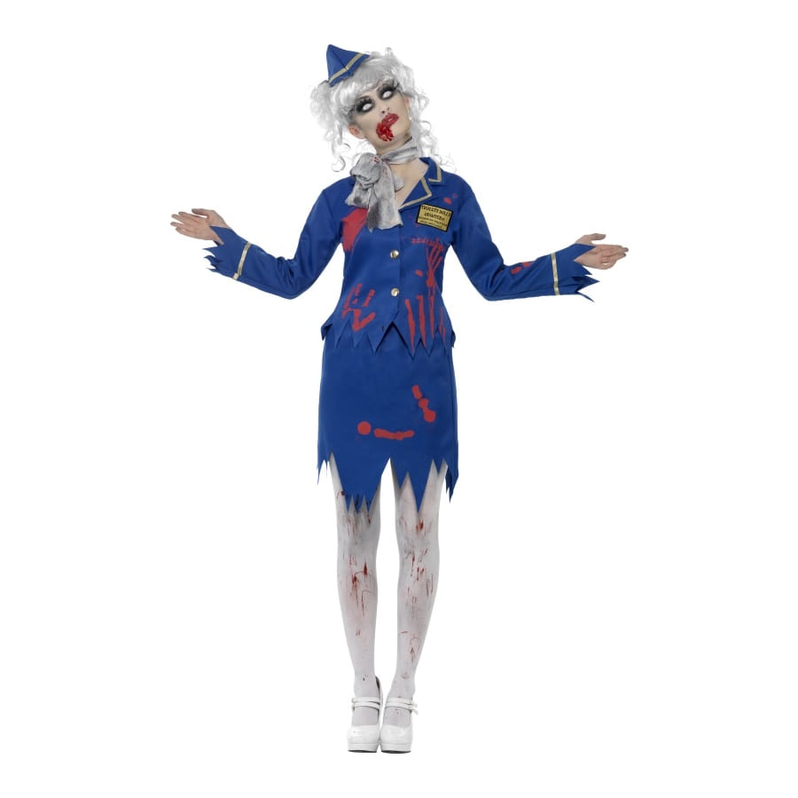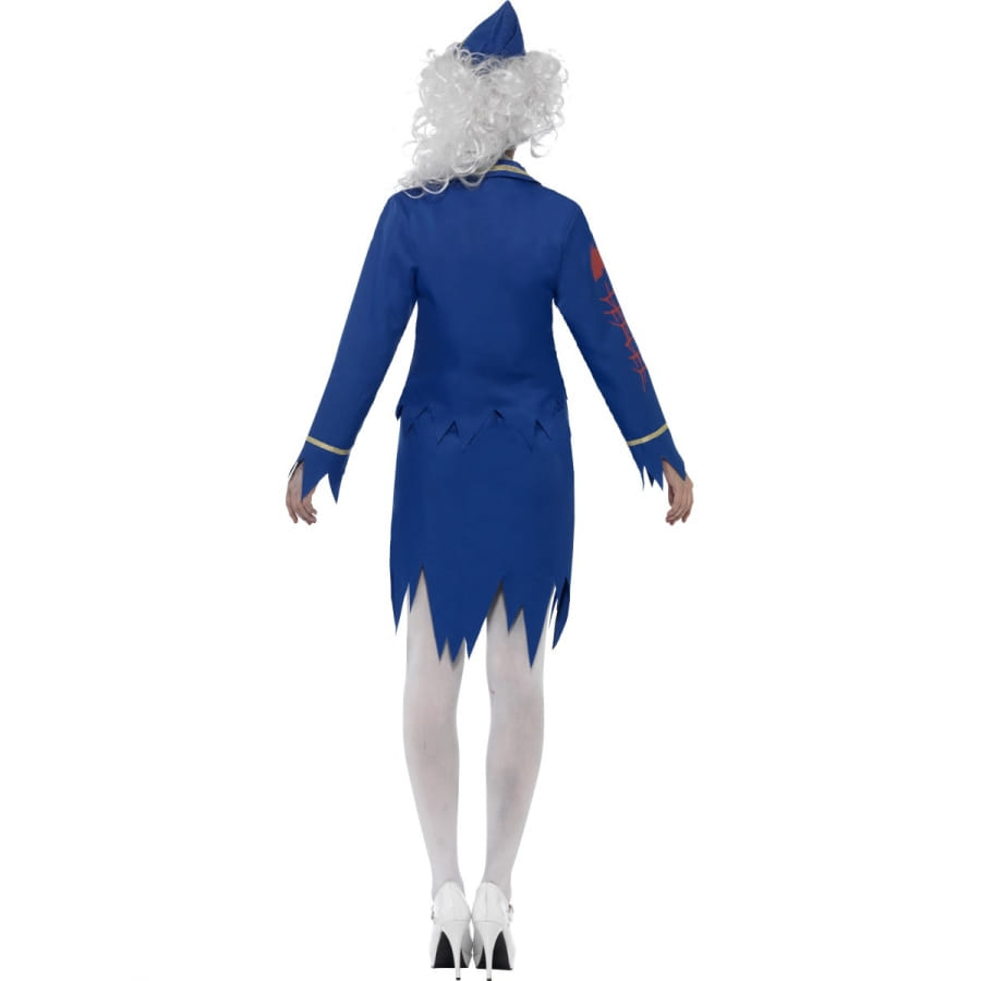 Ce déguisement de zombie hôtesse de l'air sera parfait pour une soirée horreur, uniforme et pour Halloween. Vous pourrez incarner un zombie ou une hôtesse de l'air dans ce déguisement. Il est composé d'une veste de couleur bleu avec des bordures doré et des taches de sang dessus, d'une jupe bleu avec du sang dessus, d'un chapeau bleu et doré, il est aussi composé d'un foulard.