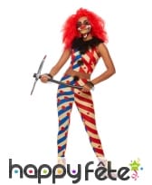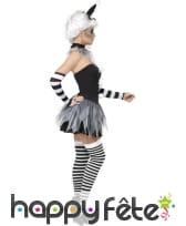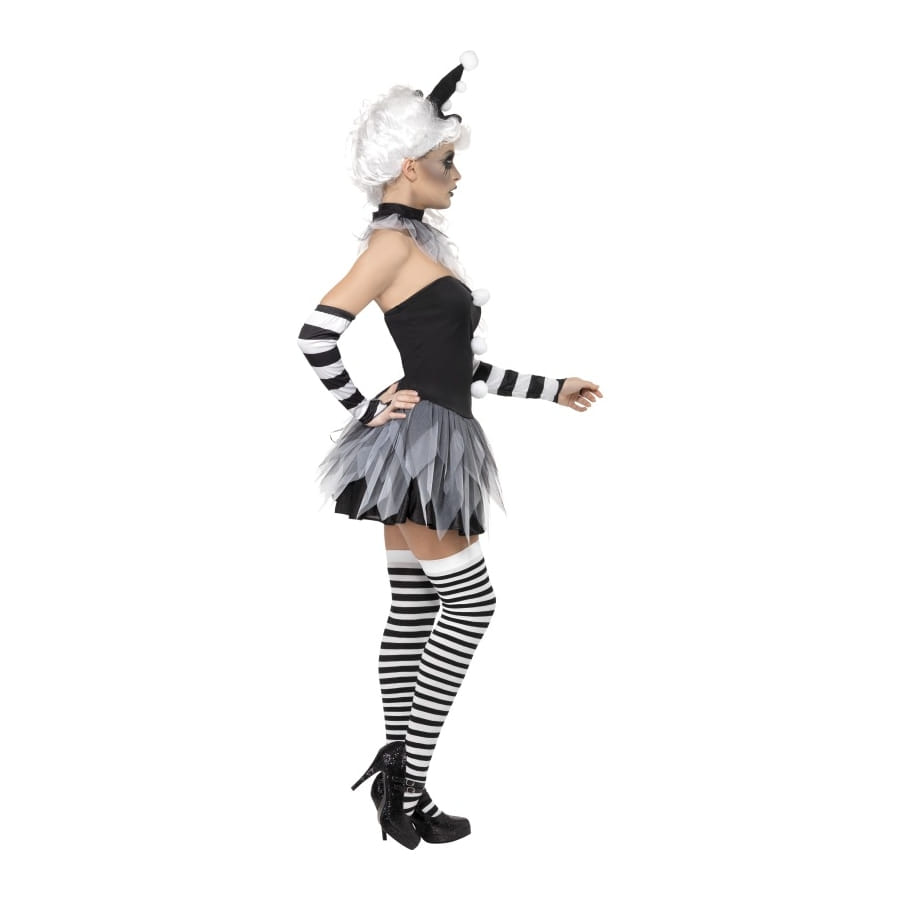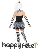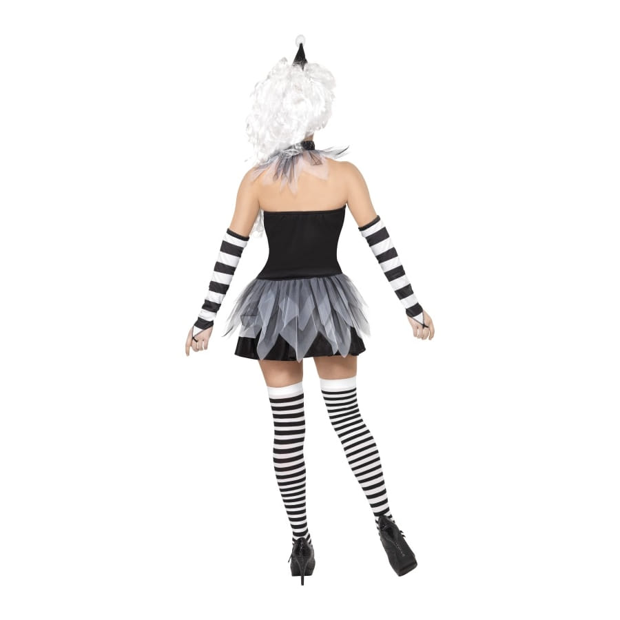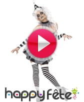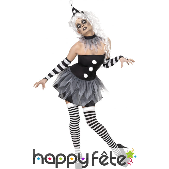 Ce déguisement de cirque sinistre pierrette taille M est composé d'une robe courte noir avec des tulles gris dessus, d'un collier noir , d'un chapeau noir avec des ronds blanc dessus ainsi que de mitaines noire et blanc. Vous pourrez le porter pour Halloween, ou une fête ayant pour thème le cirque ou horreur.
