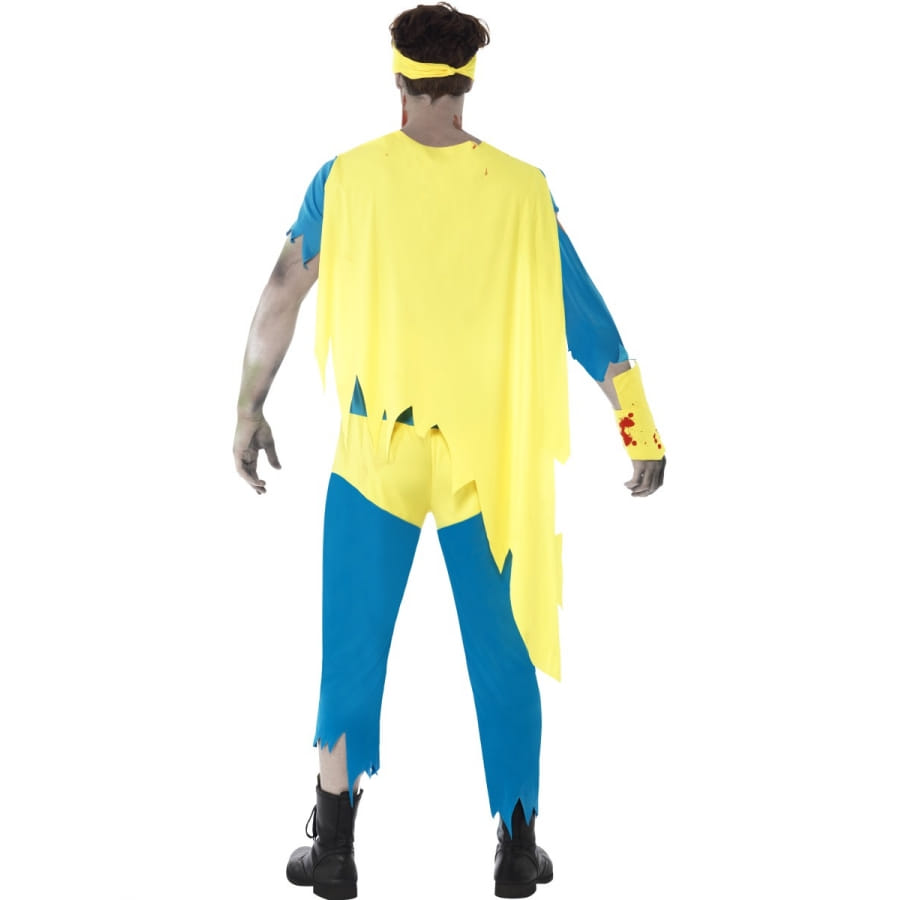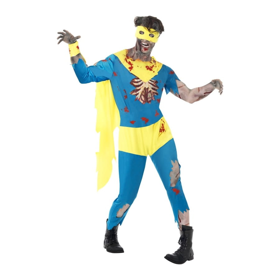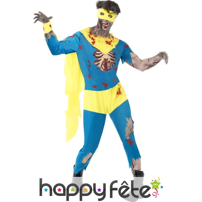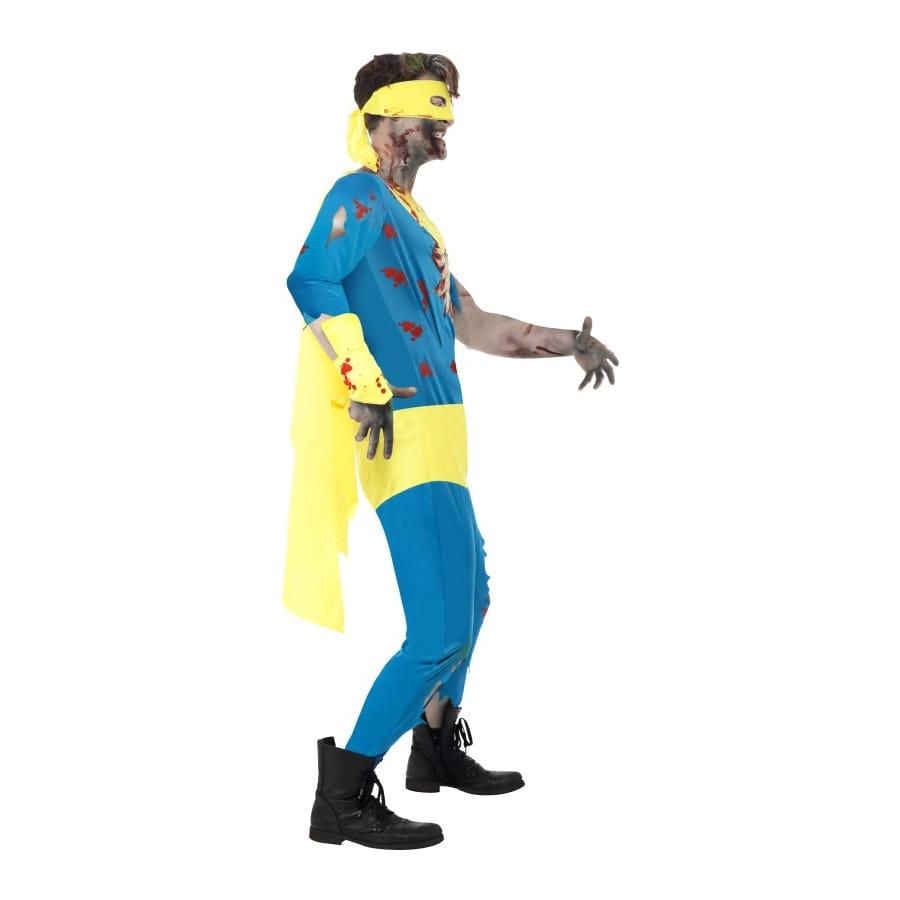 Déguisement de super-héros zombie composé d'une combinaison bleue et jaune, d'un masque jaune, d'une paire de gants et de couvre-bottes. Le tout est disponible en taille S, M ou L. La combinaison est agrémentée de latex représentant un torse déchiqueté.