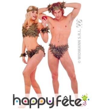 Bienvenue dans la partie déguisement Adam et Eve » du site Happyfete. Le nom vous donne le ton, ici nous retournons loin, très loin, si loin dans l'histoire, du temps où le tissu n'existait même pas, du temps où les gens ne s'habillaient même pas, du temps de nos ancêtres, des premiers hommes, Adam et Eve. Et bien sûr, puisque le tissu n'existait pas, on ne s'habillait pas vraiment, on portait ce que nous appelons plus communément, de nos jours, des petites tenues. Alors, de jolies et drôles de petites tenues, c'est ce que nous proposons dans cette partie du site, petites tenues, certes, mais en feuilles, s'il vous plaît, pour réellement retourner au temps d'Adam et Eve. Les costumes sont un peu osés mais ils sont très créatifs et sont justement faits pour se déguiser, pour se créer un personnage et entrer dans sa peau. Idéales pour être portés pour des soirées en bord de plage ou lors d'un carnaval, ces tenues sont dédiés aux plus audacieux, mais vous verrez, vous y serez tout à votre aise !