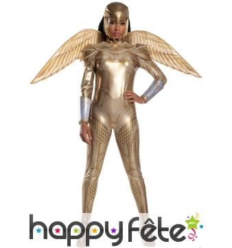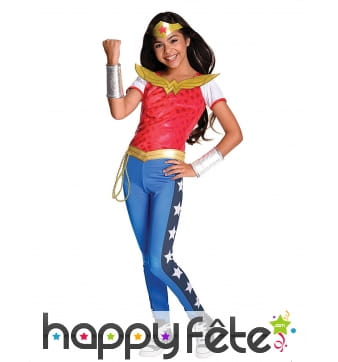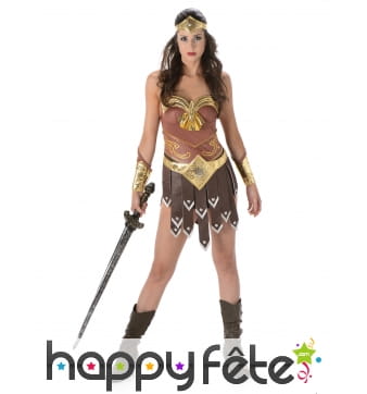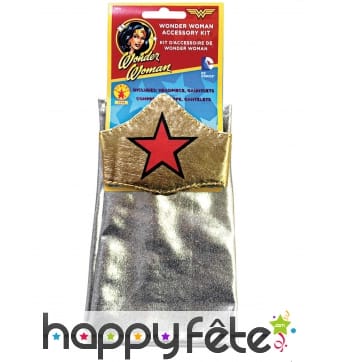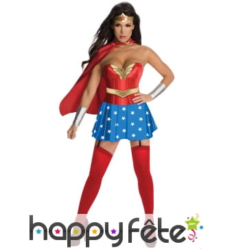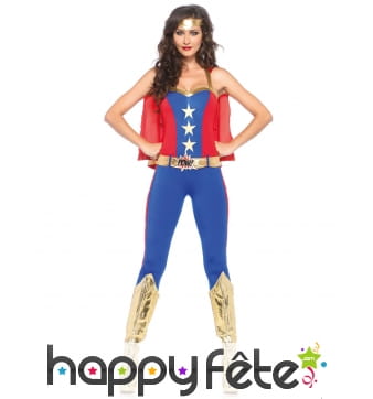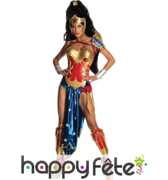 Wonder Woman était l'une des premières super-héroïnes de l'histoire des bandes dessinées. Elle est certainement encore la plus célèbre d'entre elles. Sa particularité : ambassadrice des Amazones dans le monde, elle possède différents super-pouvoirs, dont celui de son lasso magique, ses bracelets anti-balles, et sa tiare qui est un boomerang indestructible. Wonder Woman est une femme forte, belle et intelligente qui combat le mal et a pour objectif de réformer les criminels. Incarnez ce beau personnage avec les splendides costumes que nous vous suggérons. Par exemple, vous trouverez sur cette page un costume de Wonder Woman sous licence, composé d'une robe, d'une cape, d'une tiare, d'une paire de manchettes et de surbottes. La caractéristique de ce costume est que ses couleurs, sa découpe, ses accessoires ont été faits pour que l'ensemble ressemble au maximum à l'original. N'hésitez pas à naviguer le long de cette page pour trouver la perle rare ! Ce serait idéal de porter ce genre de tenue à une soirée déguisée ou à un festival. Vous serez peut-être la seule héroïne sur place !