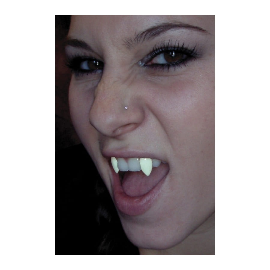 Dents de vampire lumineuses de couleur blanche pour homme ou femme. Cet accessoire est idéal pour Halloween, avec ou sans un déguisement de vampire.