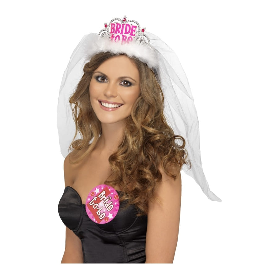Diadème en strass argenté et rose "Bride to be" avec marabout et voile blancs, idéal pour femme, fille ou adolescente. Si vous le faites porter à votre fille, ce diadème sera parfait pour un déguisement de mariée, mais pour les plus âgées, ce diadème fera fureur à l'occasion d'un enterrement de vie de jeune fille.
