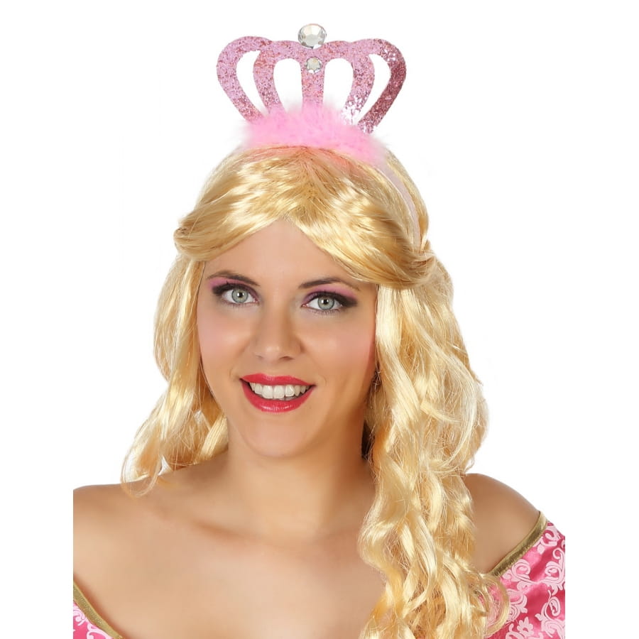 C'est un serre-tête surélevé d'un duvet rose, d'une fausse couronne pailletée et de faux joyaux.